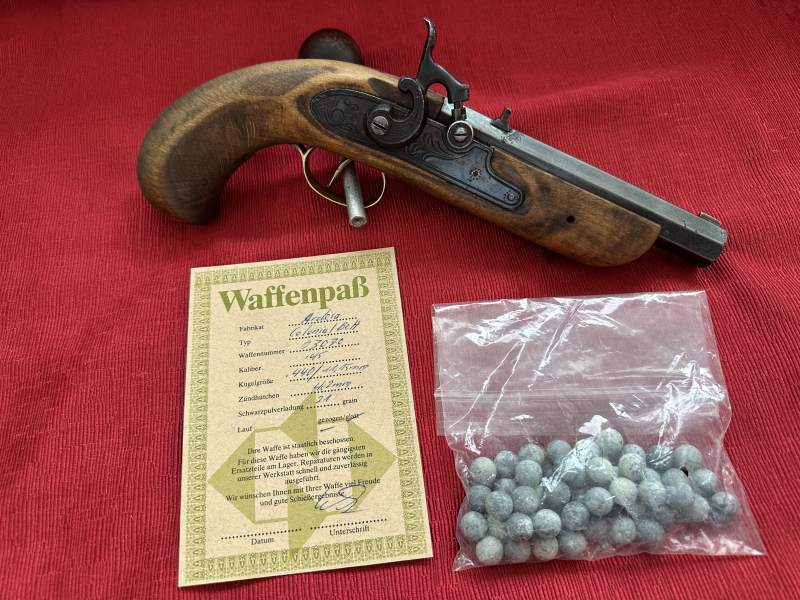 Aus Sammlung diese seltene,führige Colonial-Pistole mit dem Original dazugehörigem Waffenpaß,Kugeln und Kugelsetzer wie aus den Bildern ersichtlich.Schloss bzw.Hahn zweistufig.Gezogener Lauf.Die Bilder als Beschreibung beachten.Von privat ab 1€ ohne Rücknahme.EU-Ausland Versandkosten 20€.