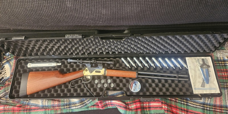 Bestandteile sind: 1x Walther Lever Action "Wells Fargo" mit Echtholzschaft (Kalieber 4,5mm/.177). Betieb mit 88g Co2 Kapsel (mit Adapter 2x12g Co2 Kapsel)