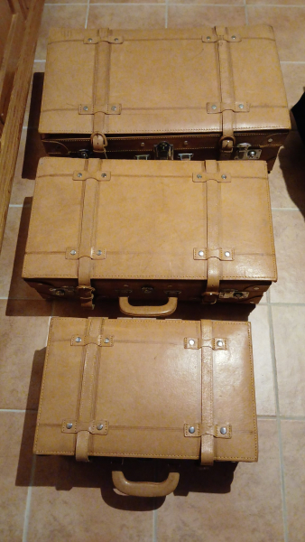 Biete hier ein Lederkofferset an,ch denke aus den 90erJahren.Das Set ist in Ordnung und es sind 4 Schlüssel vorhanden. Ich weiß nicht ob es jemals benutzt wurde, hat aber leichte Gebrauchsspuren. Passen alle drei ineinander zum wegstellen.Größe ist65cmx40cm und 59cmx35cm und 45cmx30cm.Aber schauen sie selber und wenn Fragen sind per Mail.