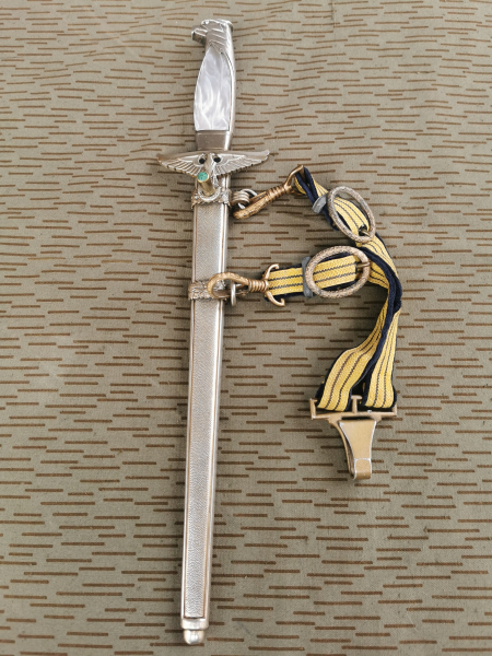 Biete im Auftrag einen Diplomatendolch. HK vorhanden ist nur abgedeckt. Das Gehänge, gehört so Original nicht mit dazu. Der Dolch, geht etwas schwer aus der Scheide.