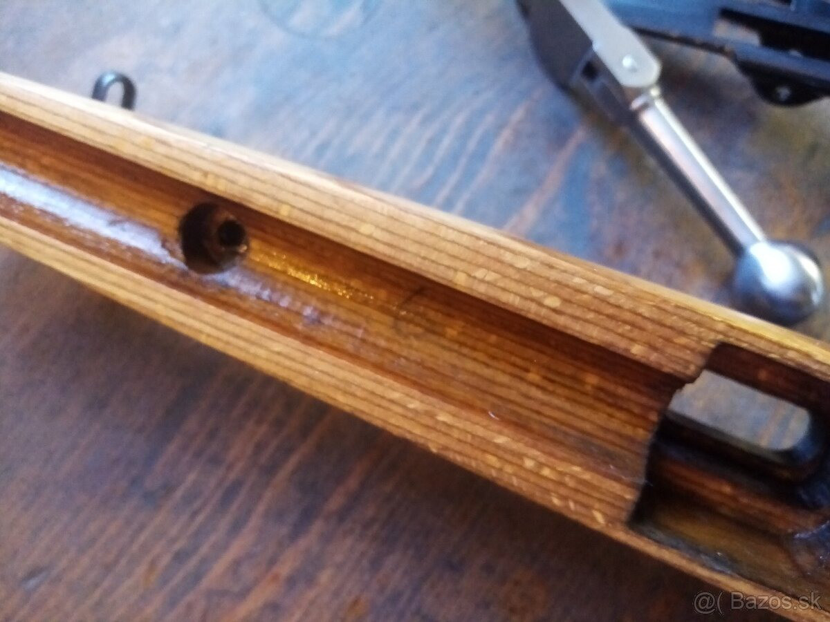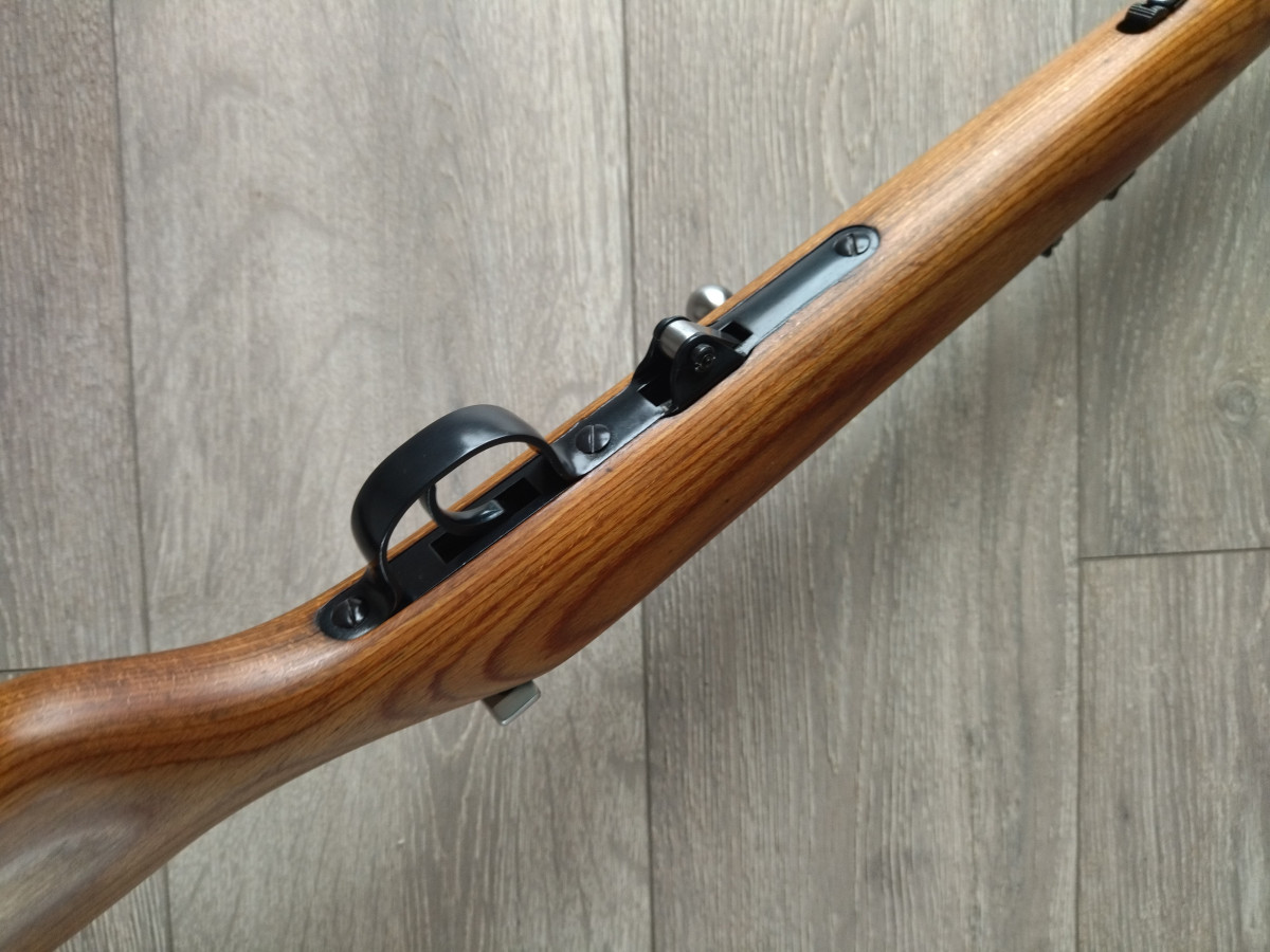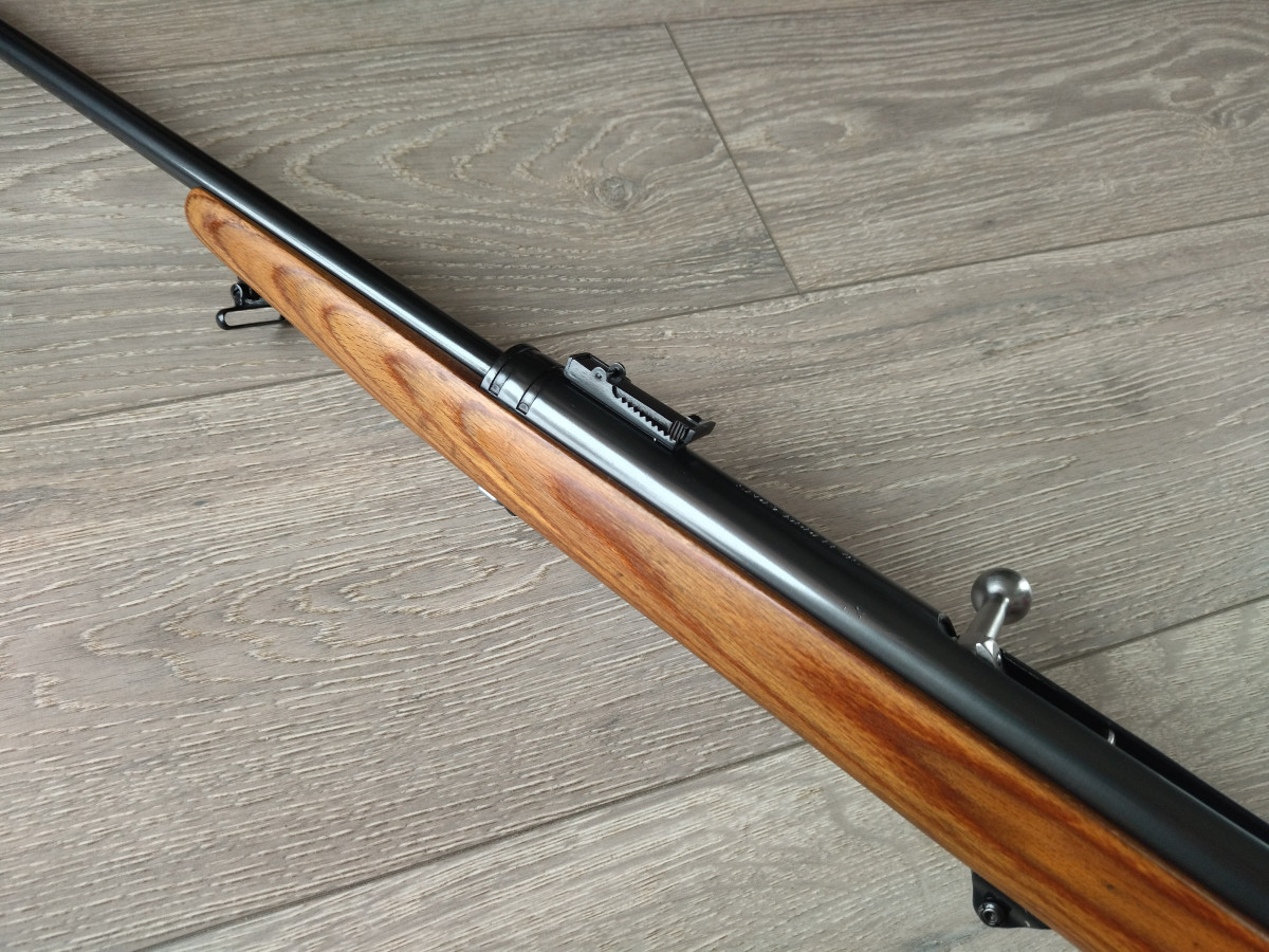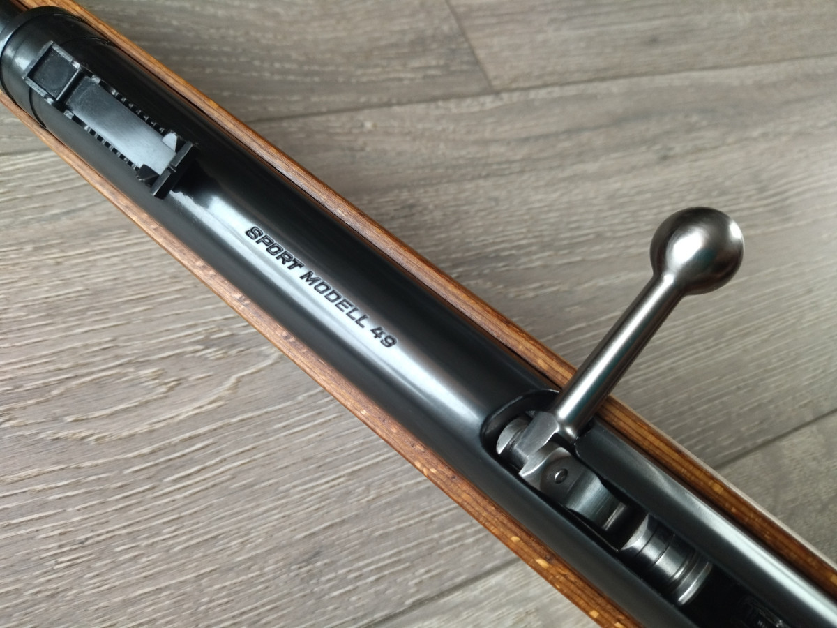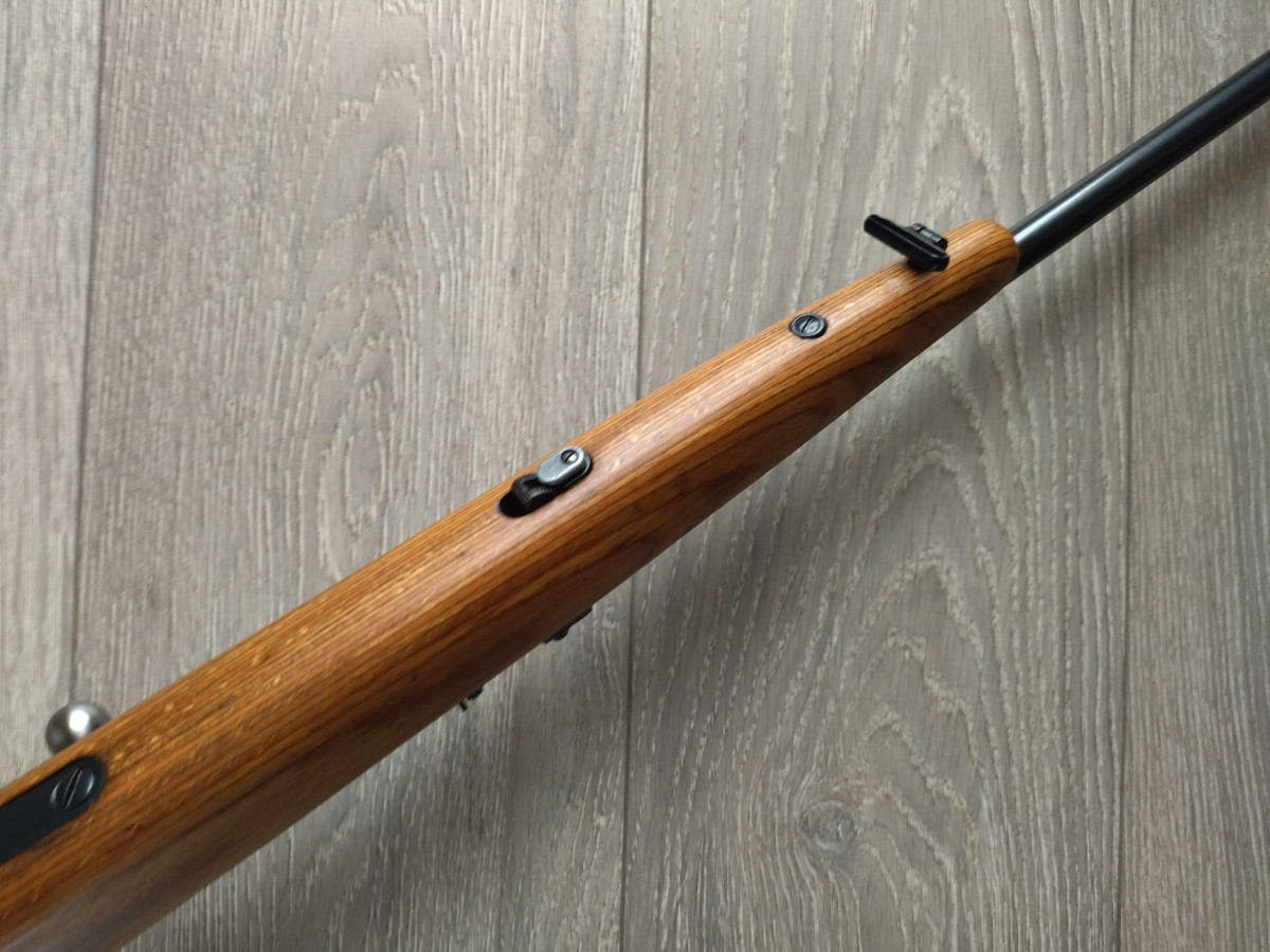 Zur Verfügung steht ein sehr seltenes Haenel Modell 49 Luftgewehr. Eine Variante, die noch gleichläufend mit dem Serienmässig hergestellte Sportmodell 49a existierte. Sehr interessant an diesem Exemplar ist, dass mehrere Teile die gleiche Herstell Nummer trägen - eingeprägte Nummer "6" befindet sich am System, Spannhebel, Abzug, Abzugsbügel und Unterlegblech, mit Bleistift ist die gleiche Nummer auch von Innen des Schaftes eingeschrieben. Luftgewehr hat noch ein paar Verschiedenheiten - Sicherungsboden aus Bakelit, nicht skaliertes Visier, Magazinhalter aus Stahl, hochwertige jagdliche Riemenhaltern fuer einen breiten Riemen, Magazin, ohne Herstellersbezeichnung. Am Schaft findet man eine Marke "Waffen Krausser - München ost", am Schaftbacke ist BJ 10.58.
