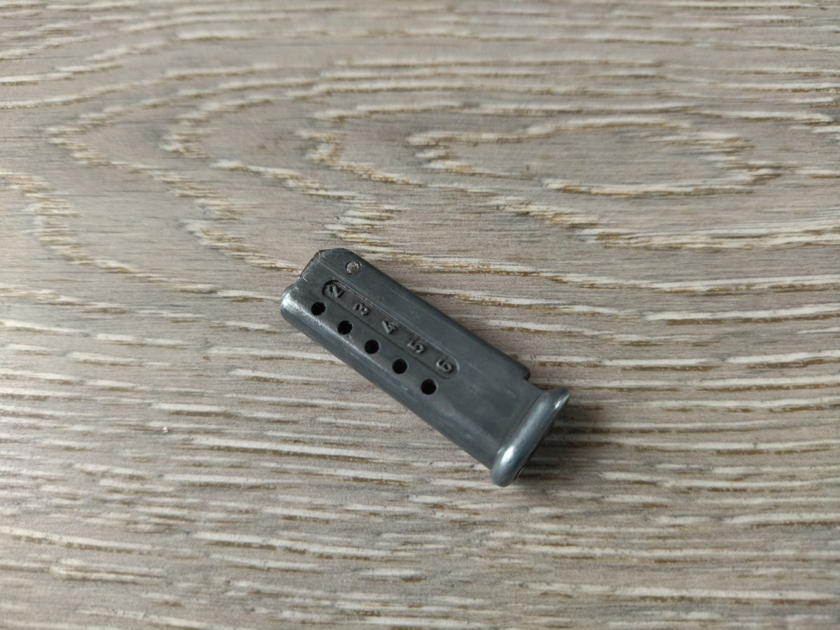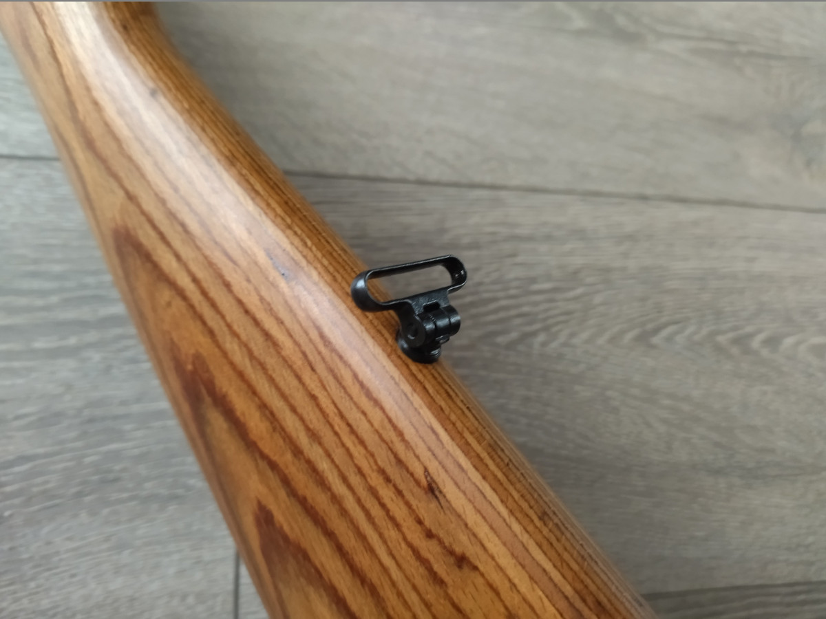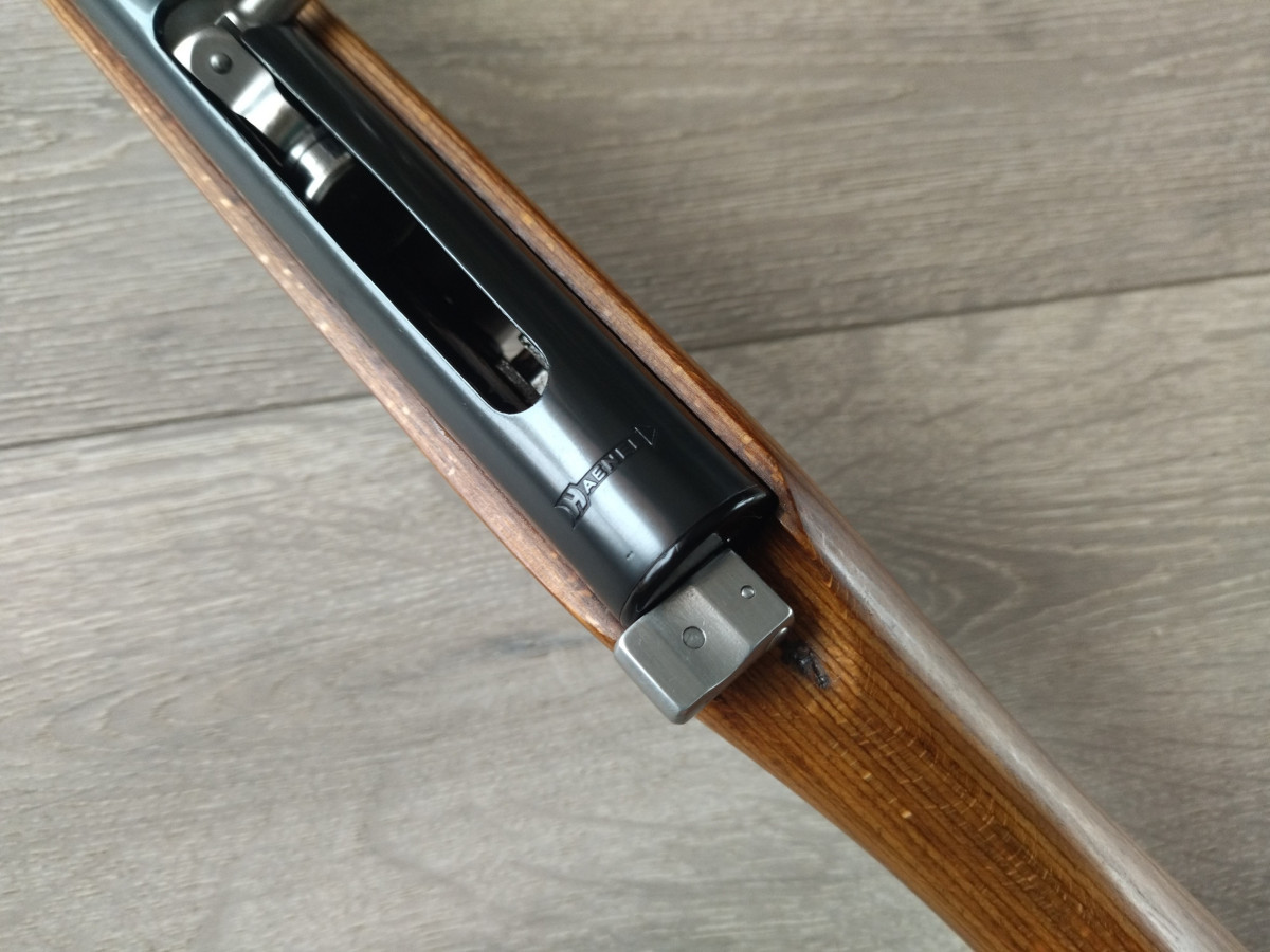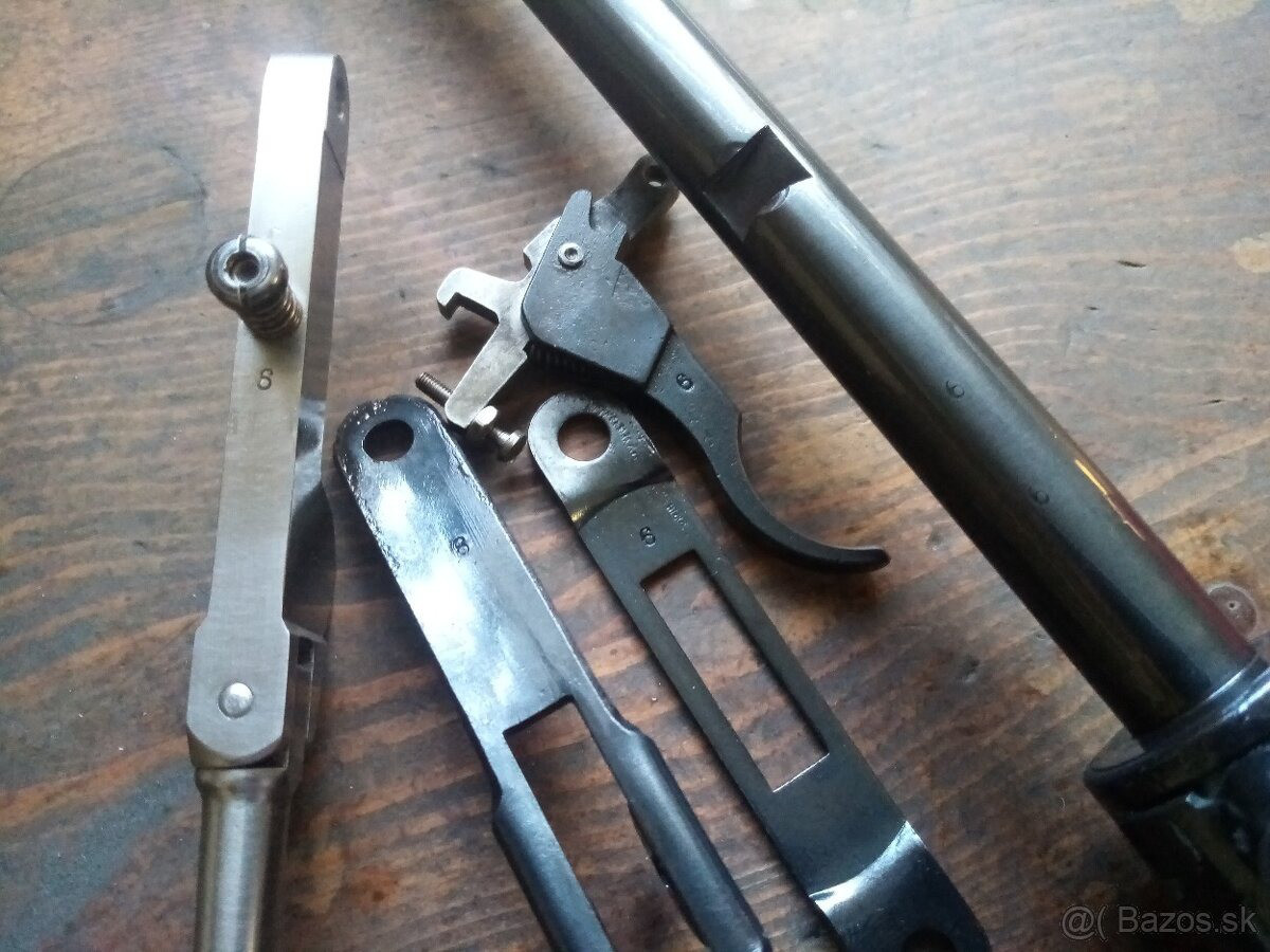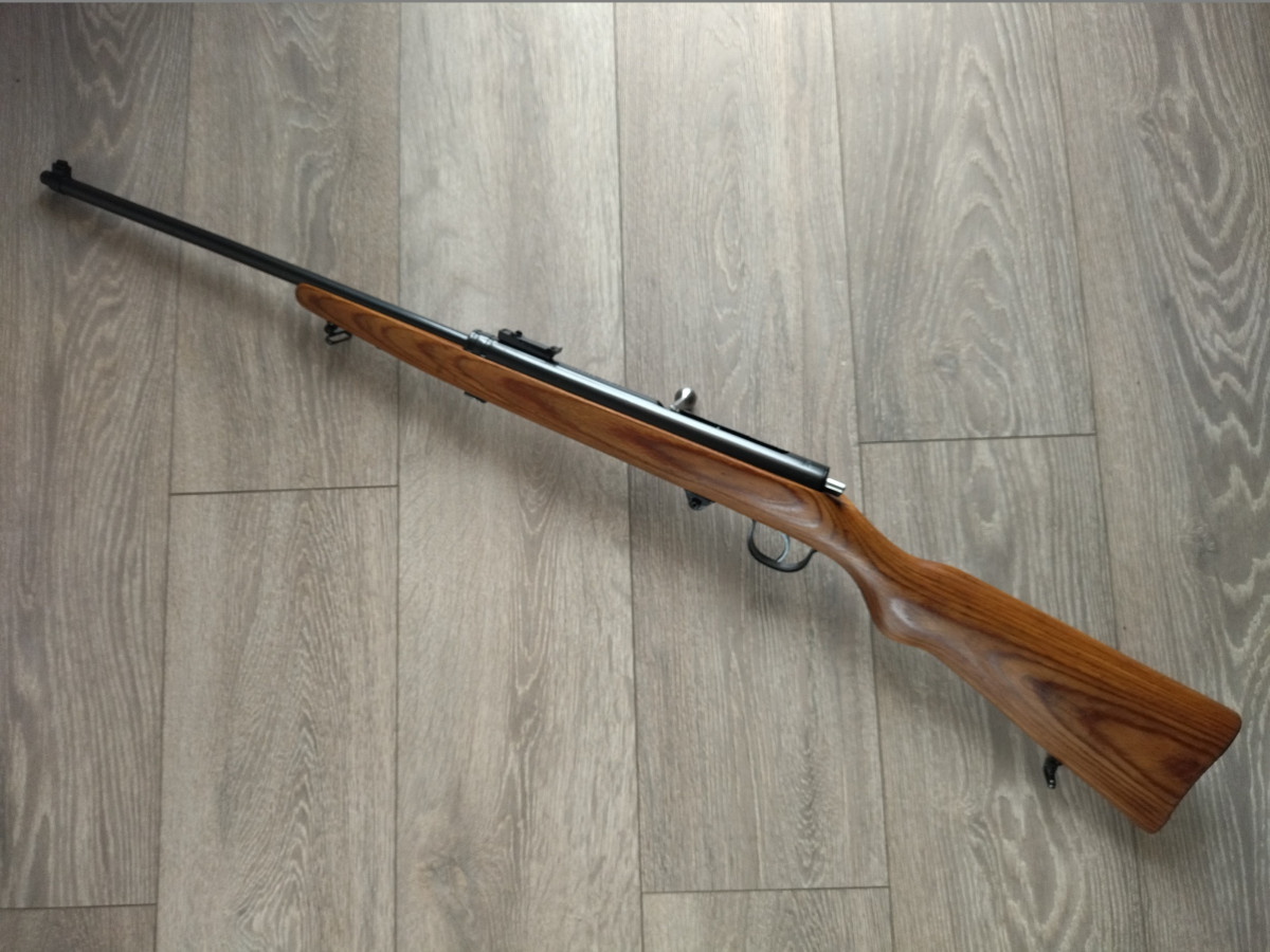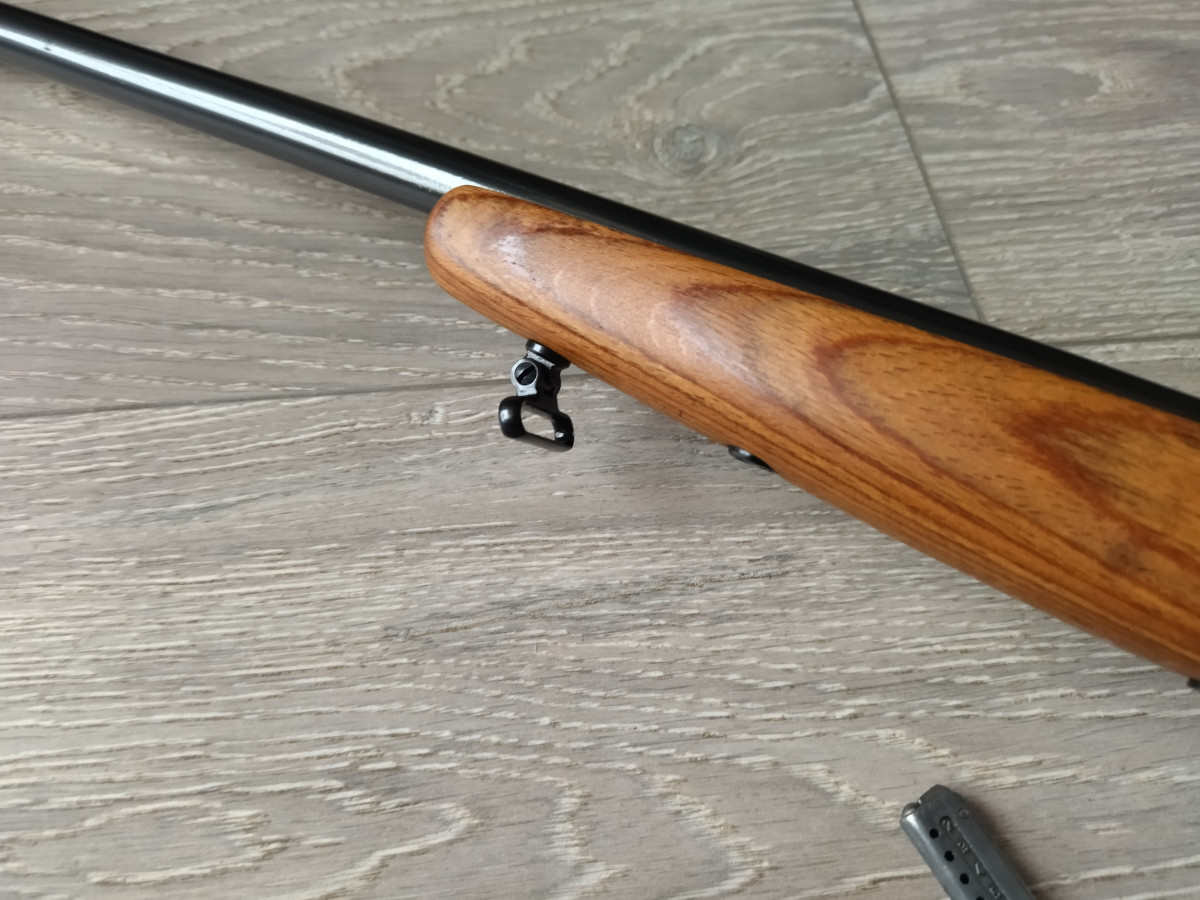 Zur Verfügung steht ein sehr seltenes Haenel Modell 49 Luftgewehr. Eine Variante, die noch gleichläufend mit dem Serienmässig hergestellte Sportmodell 49a existierte. Sehr interessant an diesem Exemplar ist, dass mehrere Teile die gleiche Herstell Nummer trägen - eingeprägte Nummer "6" befindet sich am System, Spannhebel, Abzug, Abzugsbügel und Unterlegblech, mit Bleistift ist die gleiche Nummer auch von Innen des Schaftes eingeschrieben. Luftgewehr hat noch ein paar Verschiedenheiten - Sicherungsboden aus Bakelit, nicht skaliertes Visier, Magazinhalter aus Stahl, hochwertige jagdliche Riemenhaltern fuer einen breiten Riemen, Magazin, ohne Herstellersbezeichnung. Am Schaft findet man eine Marke "Waffen Krausser - München ost", am Schaftbacke ist BJ 10.58.