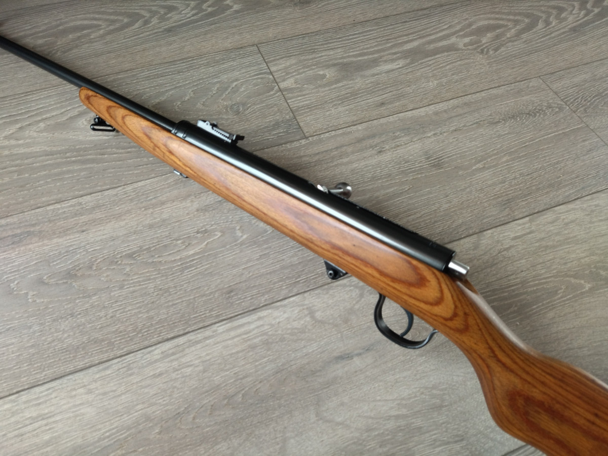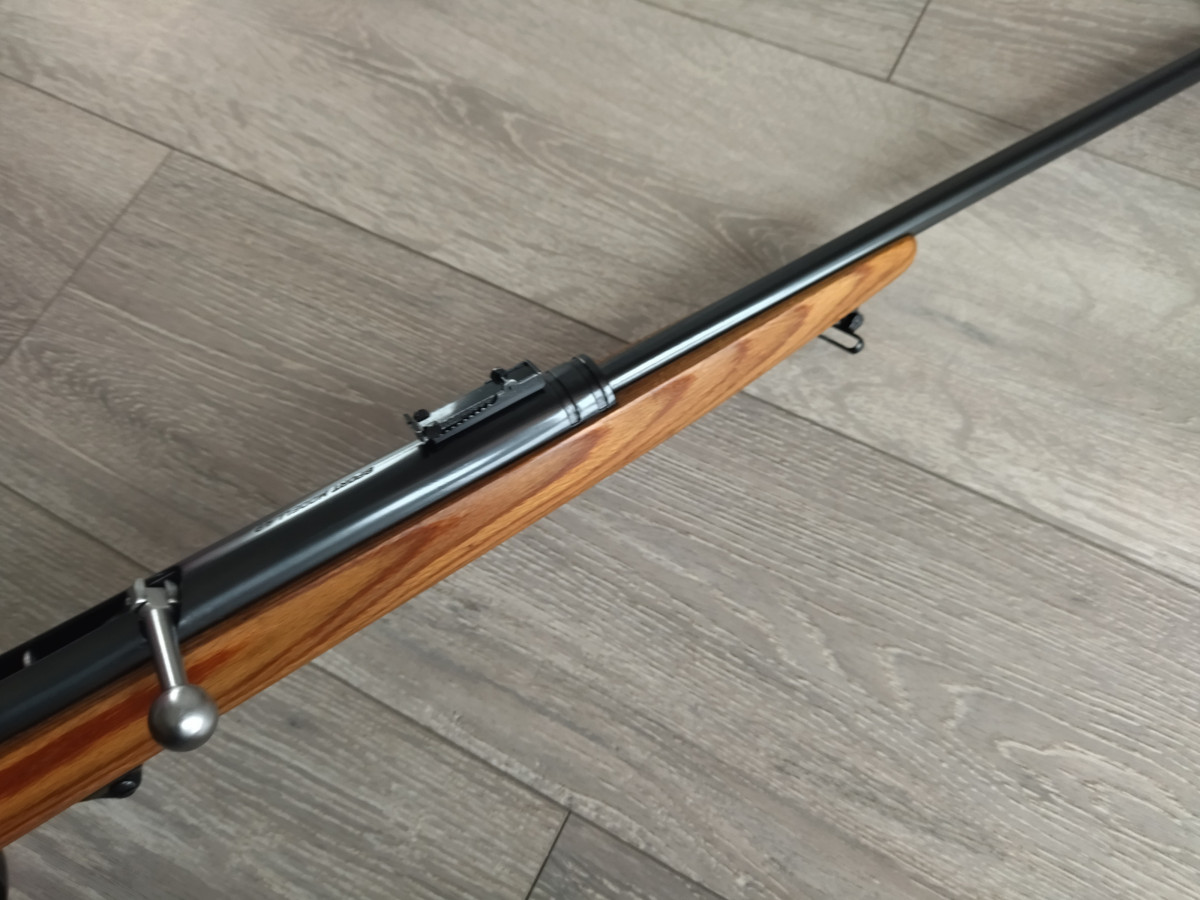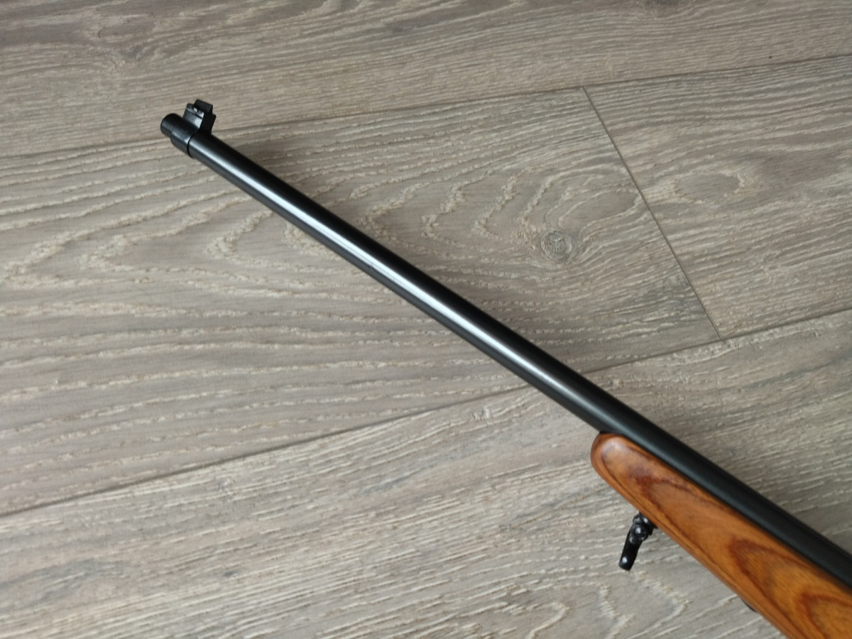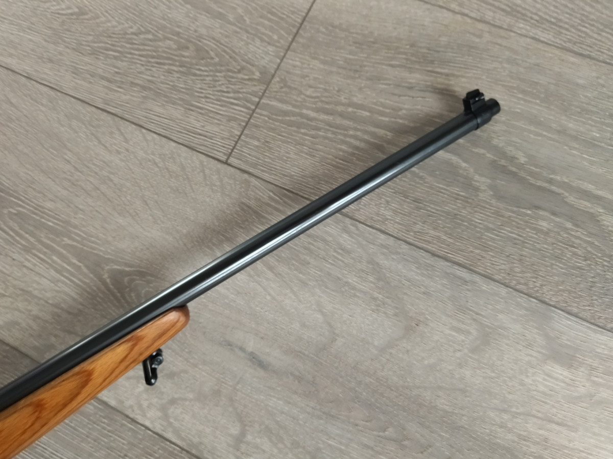 Mehrlader Luftgewehr, mit Stangenmagazin für 6 Rundkugeln, Kaliber 4.54 mm, Lauf gezogen, Manuele Abzugssicherung, Einstellbarer Abzug, Länge 1065 mm, Lauflänge 450 mm, Gewicht ca. 3 Kg. Schichtholz Schaft.