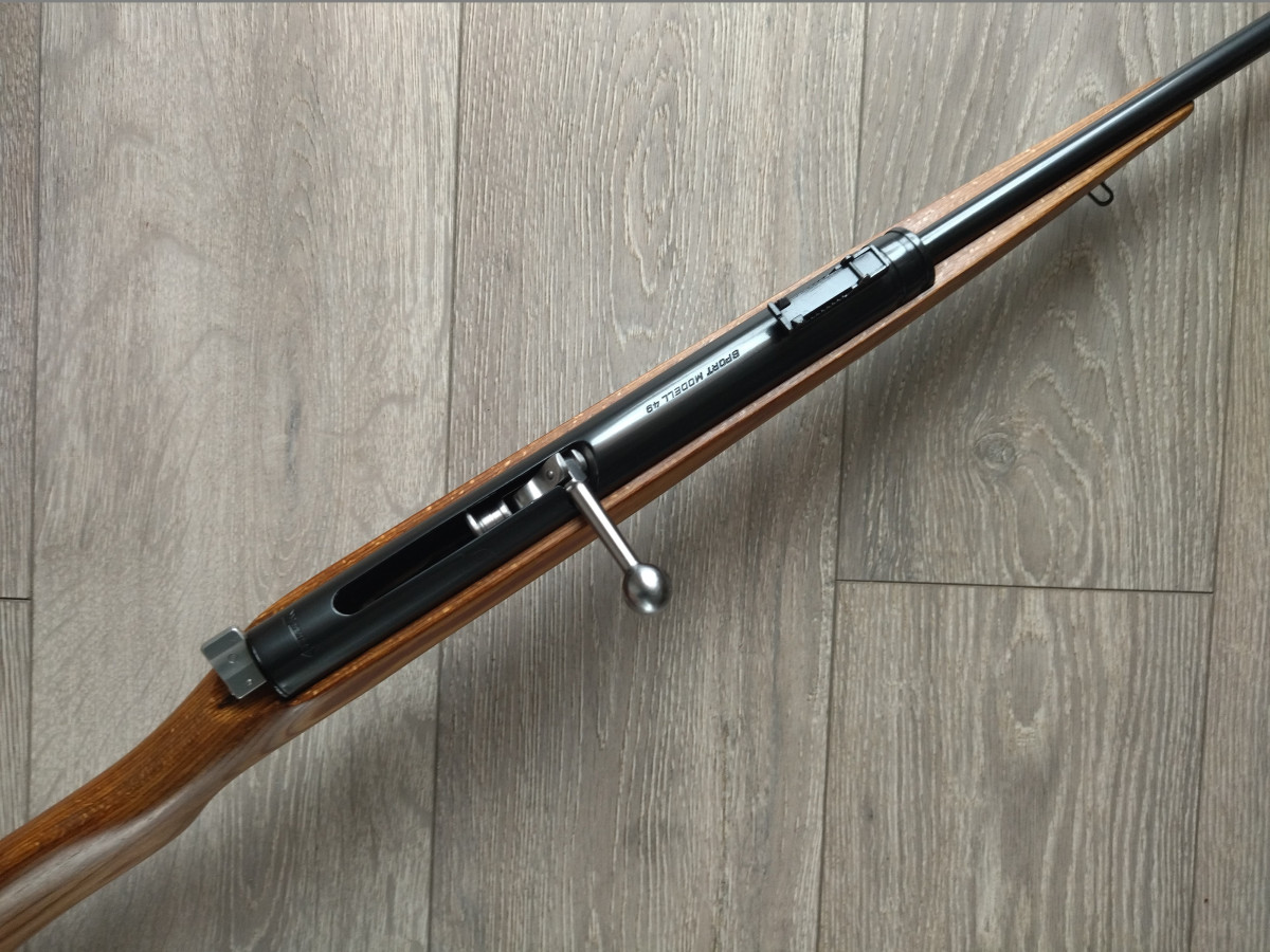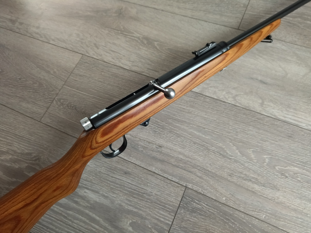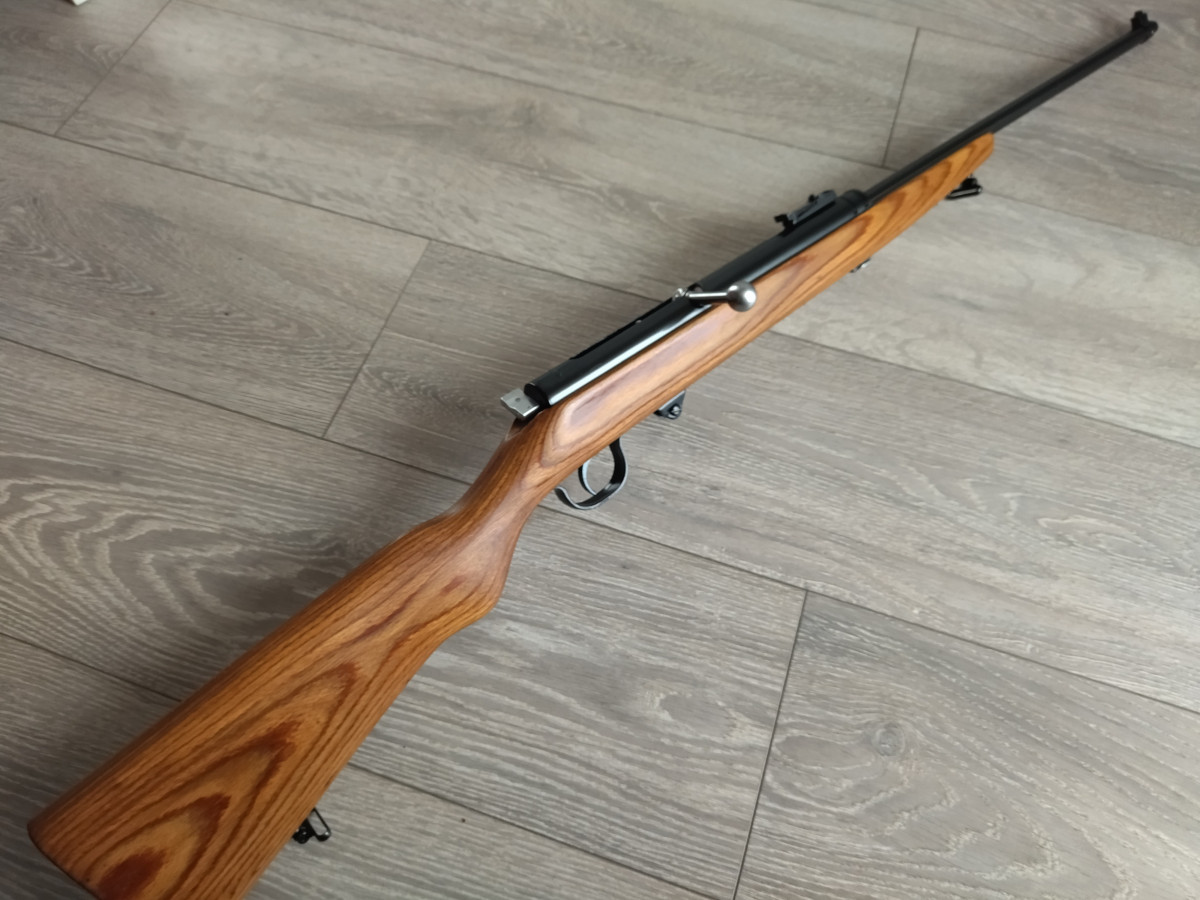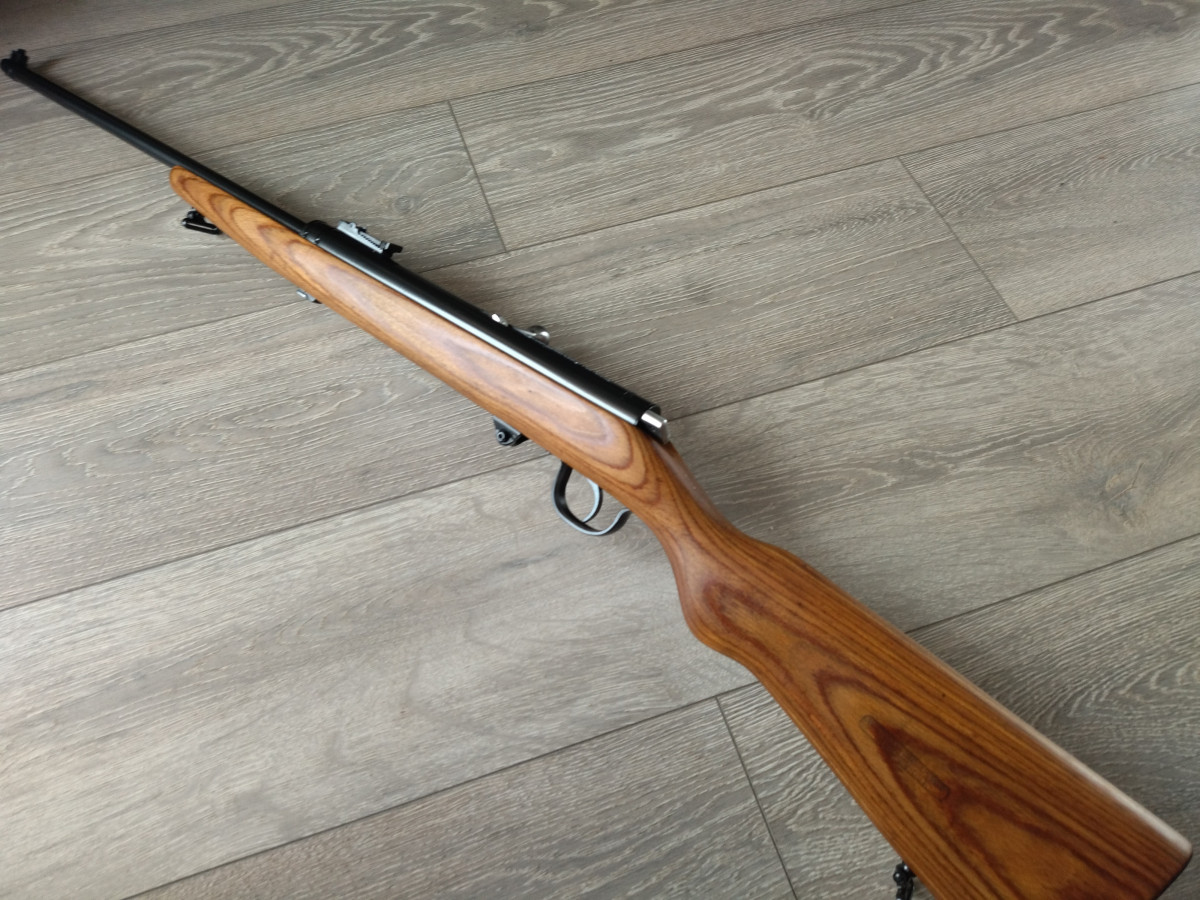 Mehrlader Luftgewehr, mit Stangenmagazin für 6 Rundkugeln, Kaliber 4.54 mm, Lauf gezogen, Manuele Abzugssicherung, Einstellbarer Abzug, Länge 1065 mm, Lauflänge 450 mm, Gewicht ca. 3 Kg. Schichtholz Schaft.