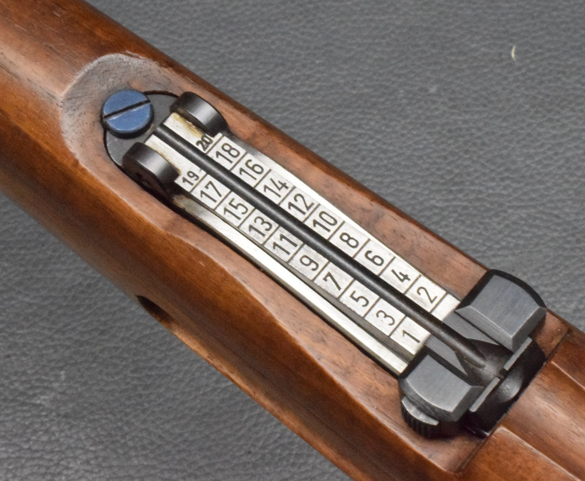 Nußbaumschaft mit Stahlschaftkappe . Lauf sehr gut, Brünierung 98%, Schaft sehr gut
