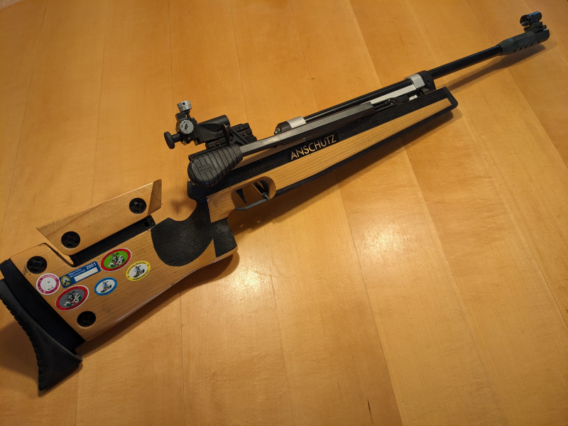 Anschütz Super Air 2002! Bewährtes System, ohne die bekannten Probleme des 2001. Meisterschaftsaufkleber können auf Wunsch entfernt werden. Schussleistung sehr gut (siehe fünf Schussbild). Visierlinienerhöhung, Bedienungsanleitung, Original Versandkarton. Kein Druckverlust!