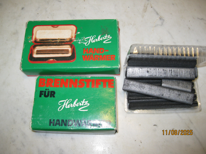 Herbertz Hand-Wärmer mit Brennstiften. Ein mal benutzt, daher fast Neuwertig. An einem Ende angezündet 9-10 Stunden Brenndauer. An beiden Enden Angezündet 4-5 Stunden Brenndauer. Gebrauchtware, keine Garantie, kein Umtausch.