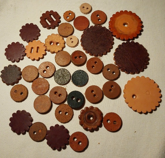 Großes Konvolut verschiedener Lederteile, Knöpfe und Scheiben zum Verzieren und Basteln, Durchmesser von 18 bis 50 mm; teilweise neu, teilweise mit Gebrauchsspuren