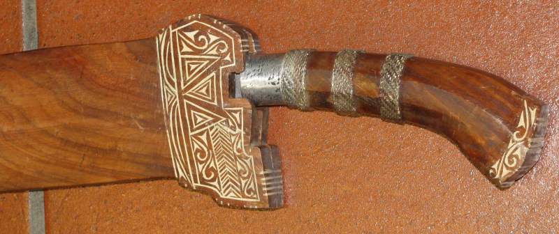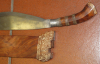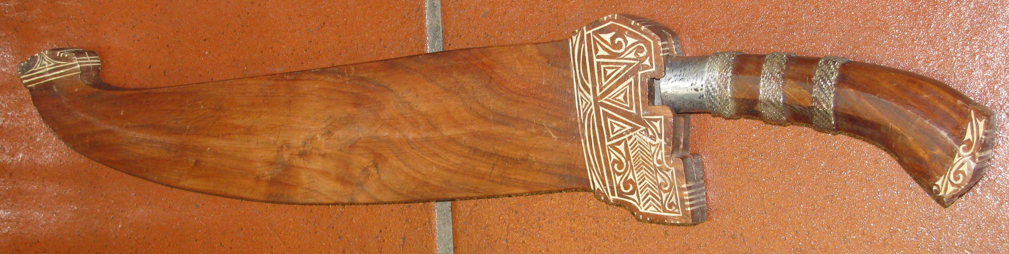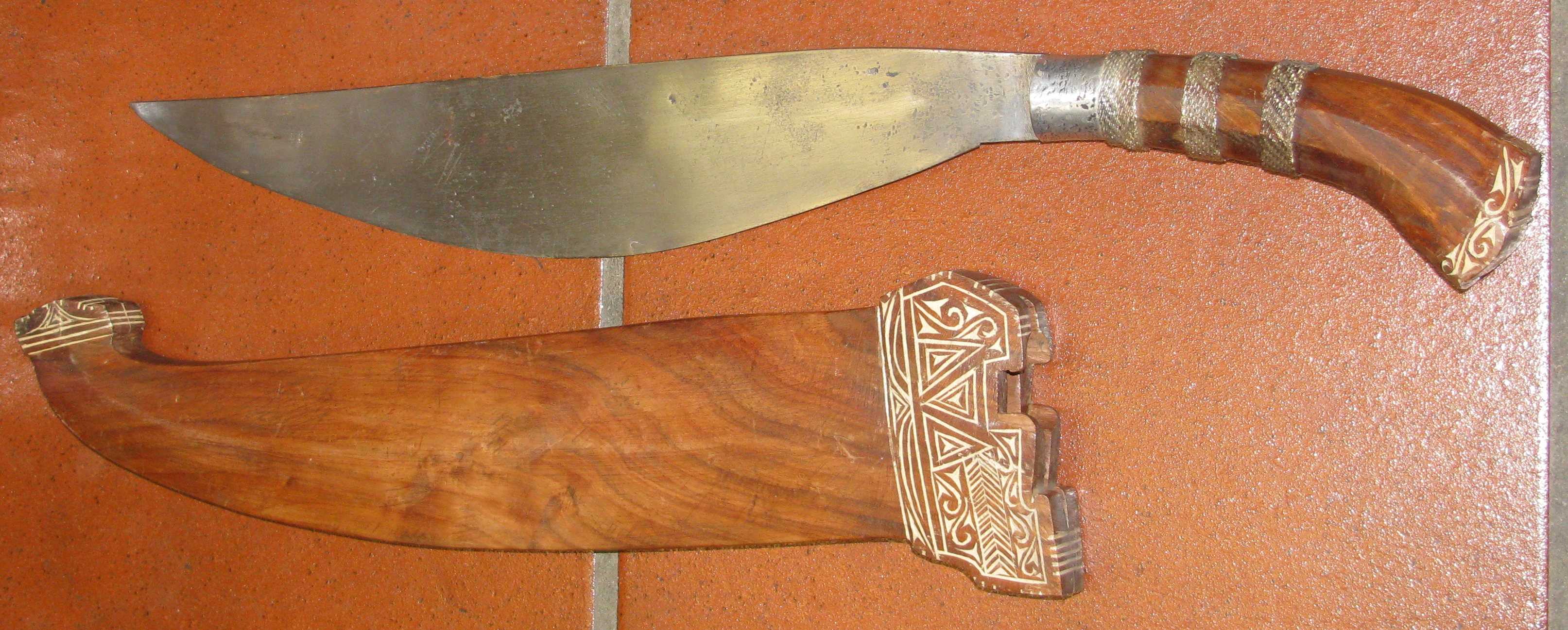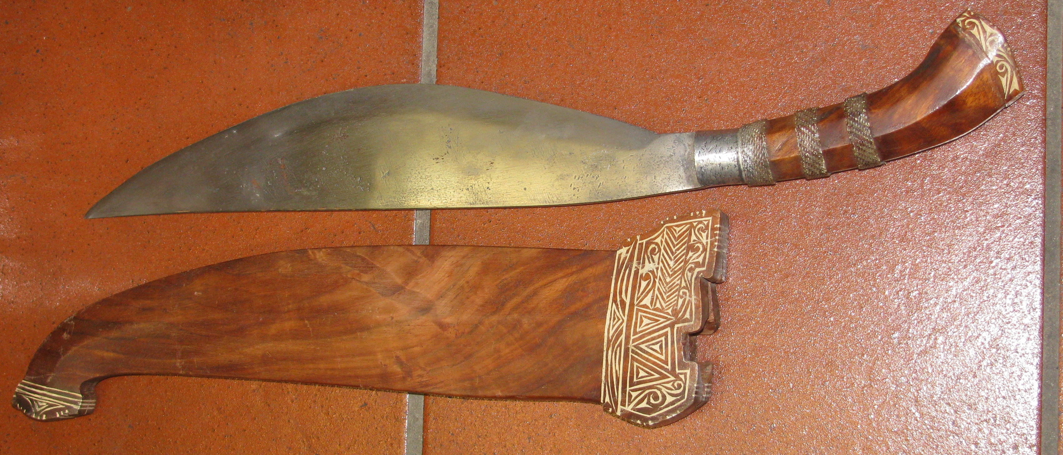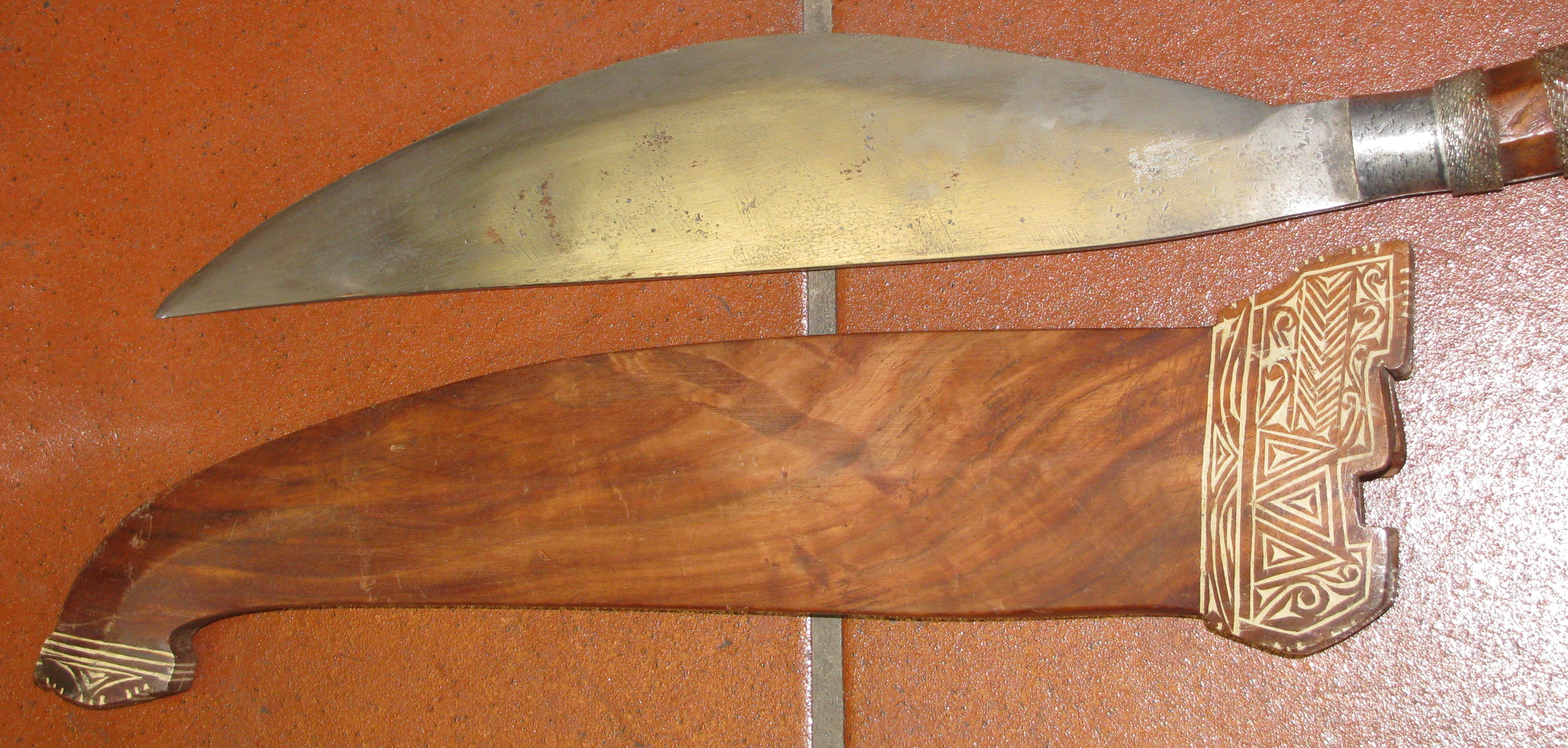 Ein schweres wuchtiges und scharfes Messer mit Holzscheide