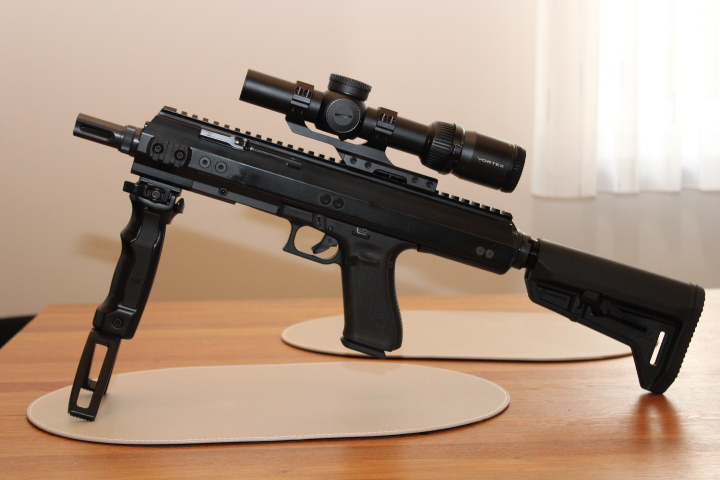 Dafür erforderlich ist das Griffstück einer Glock Pistole. Der Umbau zum Pistolenkarabiner erfolgt leicht in einer Minute. Auf youtube gibt es zahlreiche Videos dazu, auch zum Umbau.