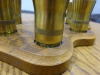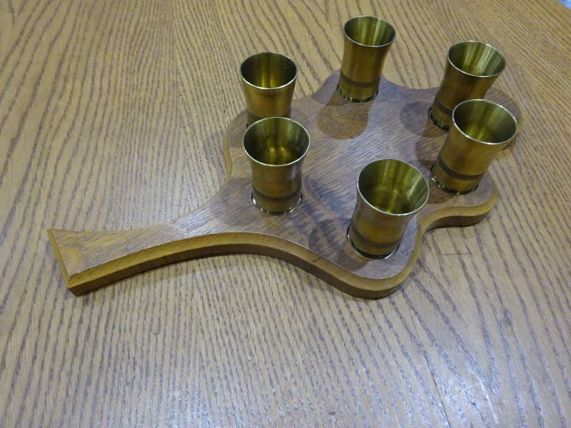6 Schnapsstamperl auf einer Eichenplatte, hergestellt aus ungestempelten Rohhülsen für die 20mm Maschinenkanone der BW, fein ausgedreht , geweitet poliert und graviert, schwere Qualität, kaum zu bekommen.
