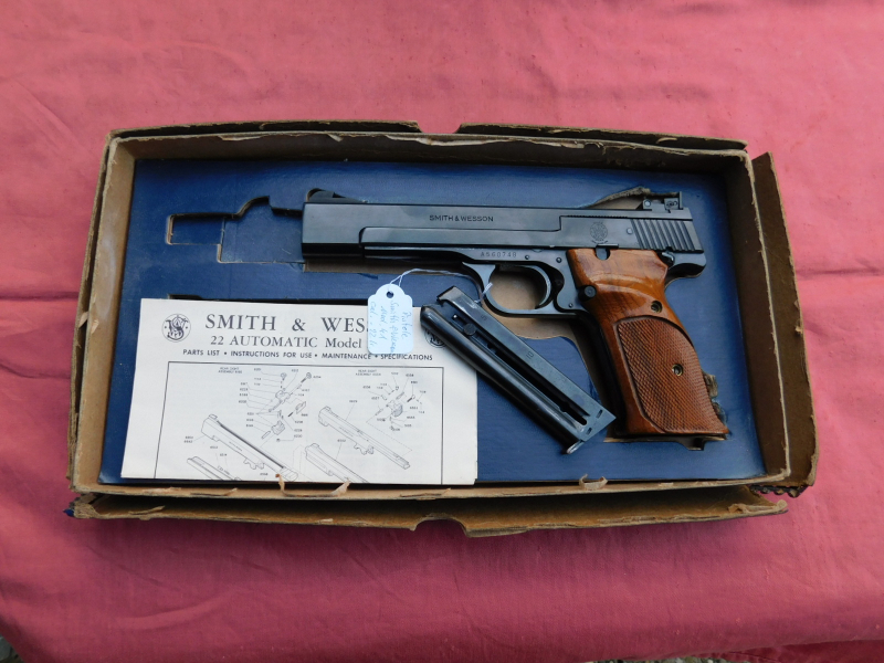 Smith & Wesson Pistole Modell 41, Kal. 22 LR, mit nummerngleicher Originalverpackung mit Bedienungsanleitung, deutscher Beschuss HK in Ulm, gute alte S&W Qualität, heutiger Neupreis ca. 2400 Euro, 1 Magazin. Kein weiteres Zubehör. Für mich sind fast keine wenn nur minimale Gebrauchsspuren sichtbar! Lauf innen spiegelblank und Profil scharf.