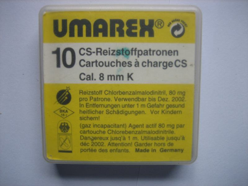 Aus Sammlungsauflösung wird angeboten -- Eine Schachtel mit 10 Stk. Gaspatronen - mit Kunststoff Faltverschluß - starke Ladung - Hersteller UMAREX - 8 mm für Pistole - Ladung: 80 mg. Chlorbenz ... - Patronen wurden kühl und trocken gelagert - Haltbar bis 12/2002 -- Patronen können Oxidationsspuren aufweisen +++ Der Versand erfolgt mit DHL (unversichert). Die Versandkosten gelten nur für Deutschland. -- Kein Internationaler Versand -- Privatverkauf, daher keine Gewährleistung, Garantie oder Rücknahme. Bei Fragen einfach mailen.