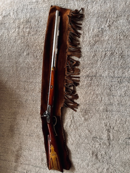 Ich verkaufe eine Hawken Perkussions-Rifle, Sondermodell ALAMO, mit Gewehrhülle-Wildleder mit Fransen.