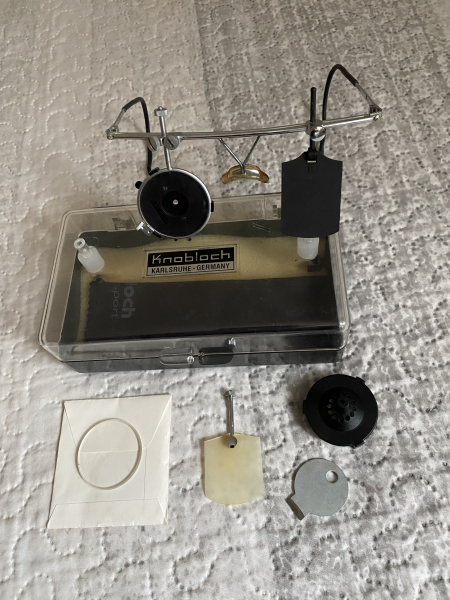 Schießbrille Knobloch für Pistole oder Gewehr. Zustand Neuwertig. Individuell verstellbar. 1mal Glashalter Durchmesser 37mm, 1mal abnehmbare verstellbare Irisblende, 1 Blende in weiß, 1 Blende in schwarz, dreh-und klappbar, 1mal Schlüssel, 1 Stück Einstelltrichter, 1mal Glas +1,50 Dioptrien. Original Transportbox.Verkauf ohne Garantie oder Rücknahme.