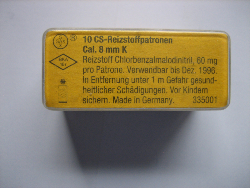 Aus Sammlungsauflösung wird angeboten -- Eine Schachtel mit 10 Stk. Gaspatronen - mit Kunststoff Faltverschluß - starke Ladung - Hersteller SAX - 8 mm für Pistole - Ladung: 60 mg. Chlorbenz ... -- Verwendbar 12 - 1996 ++ Patronen wurden kühl und trocken gelagert -- Patronen können Oxidationsspuren aufweisen +++ Der Versand erfolgt mit DHL (unversichert). Die Versandkosten gelten nur für Deutschland. -- Kein Internationaler Versand -- Privatverkauf, daher keine Gewährleistung, Garantie oder Rücknahme. Bei Fragen einfach mailen.