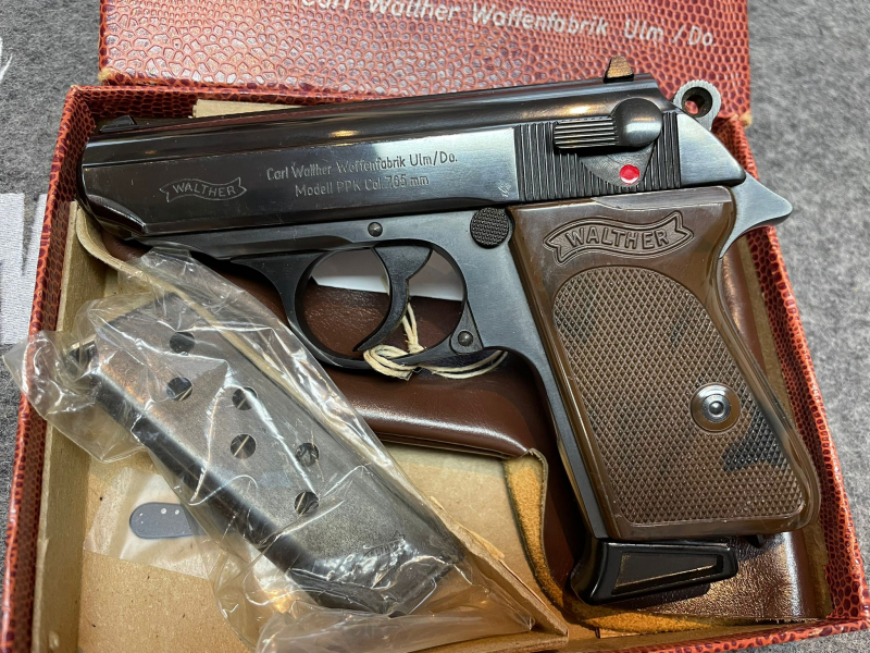 Walther PPK im Kaliber 7,65 mm Browning, Beschuss 1968. Nummerngleich (Holster ausgenommen). Inkl. Ersatzmagazin, Lederholster und originalem Karton. Top Brünierung, kaum geschossen, stammt aus Jägerhaushalt. Gewicht ca. 600 g. Sehr guter Zustand 2+ – für das Alter hervorragend erhalten. Verkauf nur an berechtigte Erwerber.