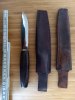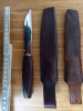 Verkaufe Messer mit Dreilagenstahl-Kinge von Helle / Norwegen mit handgefertigter, neuer Rechthänder-Scheide und alter, stark gebrauchter Linkshänder-Scheide (Original) aus den 70er Jahren. Klinge lässt sich einfach sehr gut nachschärfen.