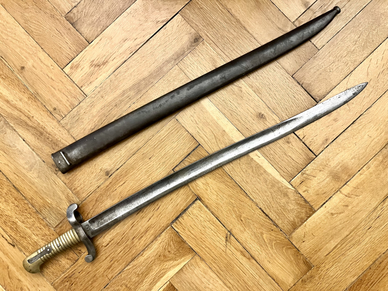 Original M1866 Bajonett in gutem Zustand. Drücker gängig, zugehörige Scheide schliesst sauber ab.