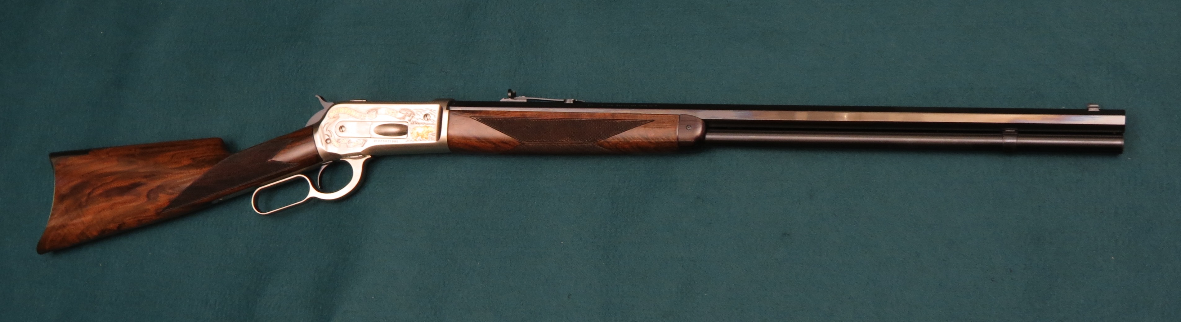 Markierungen: Die linke Seite des Laufs trägt die Aufschrift „BROWNING ARMS COMPANY MORGAN, UTAH & MONTREAL P.Q. / MADE IN JAPAN“ und „.45-70 GOVT“. Die rechte Seite des Laufs trägt die Aufschrift „BROWNING MODEL 1886 CALIBER .45-70 GOVT“. Der Systemschwanz trägt die Aufschrift „BROWNING MODEL 1886“. Die Gravuren an den Seiten des Gehäuses sind mit Goldakzenten versehen.