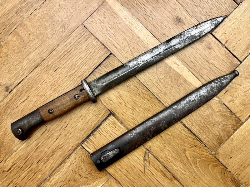 Original 84/98 in gutem Zustand. Drücker gängig, zugehörige Scheide schliesst sauber ab.