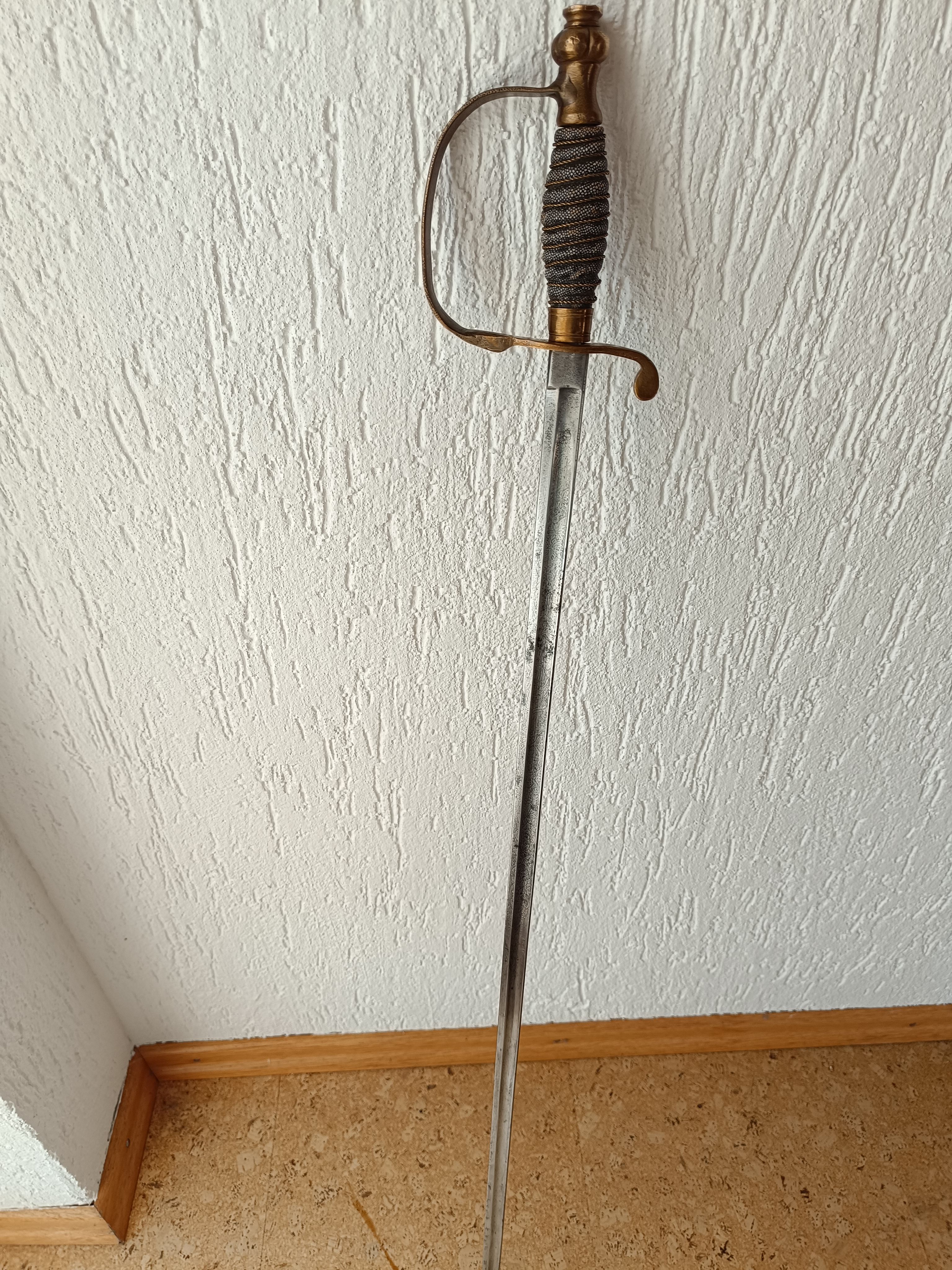 Griff ist Rochenhaut mit Draht Wicklung in tagt kein Rost auf der Klinge stark abgetragen die zisilirung ist noch leicht zu erkennen, ich vermute dass es sich um einen umgebauten Militär Degen handelt darum wird das Stück als defekt verkauft,der Händler ist auf der Klinge Mohr Berlin,dies ist ein privater Verkauf keine Garantie oder Rücknahme
