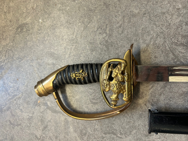 Messinggefäß mit Klappscharnier, Adler noch mit allen Herrscherinsignien. Griff mit intakter Drahtwicklung. Beidseitig blanke Klinge, auf der vorderen Seite befindet sich der Herstellerstempel Weyersberg & Co.Solingen Die Scheide ist schwarz-lackiert in guter Erhaltung, aber ich denke nicht mehr in Gänze Originallack.
