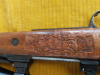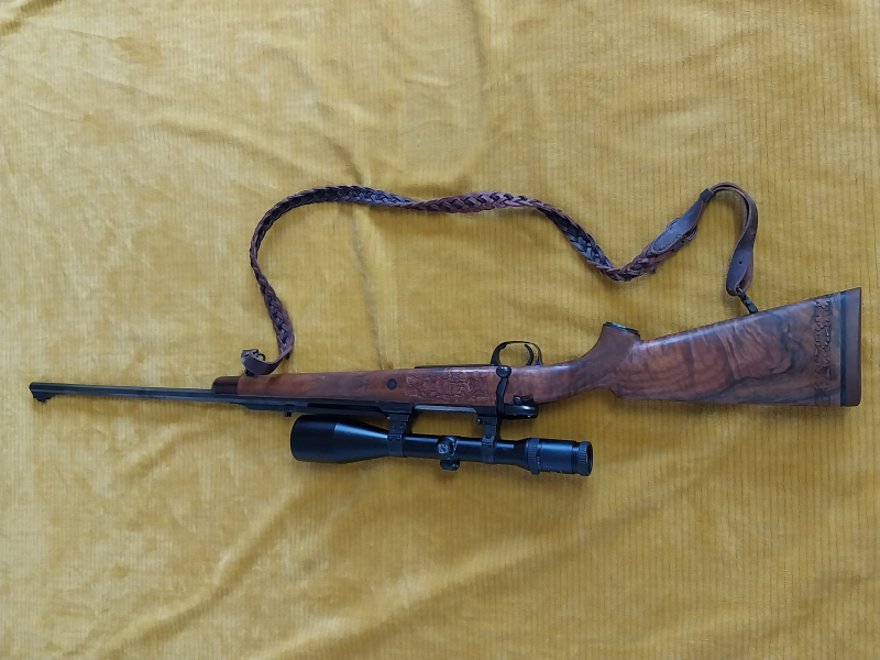 Handschutz links und rechts mit handgeschnitzter Gravur (Keiler bzw. Rehbock). Schaft ebenfalls handgeschnitzt mit