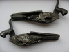 Doppelläufige Kutscherpistole Antike doppelläufige Kutscherpistole, um 1855, Schwarzpulver. Das Fach für die Zündhütchen befindet sich am Griffende. Sie ist mit dem originalen Putzstock und Bronzebeschlägen ausgestattet, der Schaft ist graviert. Gesamtlänge ca. 35 cm. Sie trägt mehrere Beschusszeichen, darunter ELG*, EL und den Turm. Das gravierte rechte Schloss trägt die Inschrift A.ESPINGARDA IN GLEZA, das linke Schloss die Inschrift A.A.B., RIO-DE-JANEIRO und ruada. 102. Dieser Pistolentyp wurde ursprünglich von Alexander Laport hergestellt. (Alexandre Laport, geboren 1782 in Lüttich, reiste 1818 nach Brasilien, um in Rio de Janeiro Waffen zu verkaufen. Er starb am 7. Januar 1855 im Alter von 73 Jahren.) Seine Waffe wurde um 1850 von Alexandre Laport vertrieben. Die schlosse functioneren etwas wackelich Nur für display