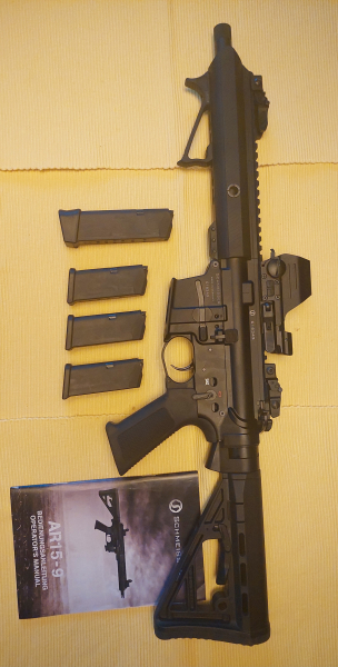 SL-Büchse Schmeisser AR15-9, Kaliber 9mm Luger mit abnehmbarer Klappvisierung und Falke LE Reflexvisier