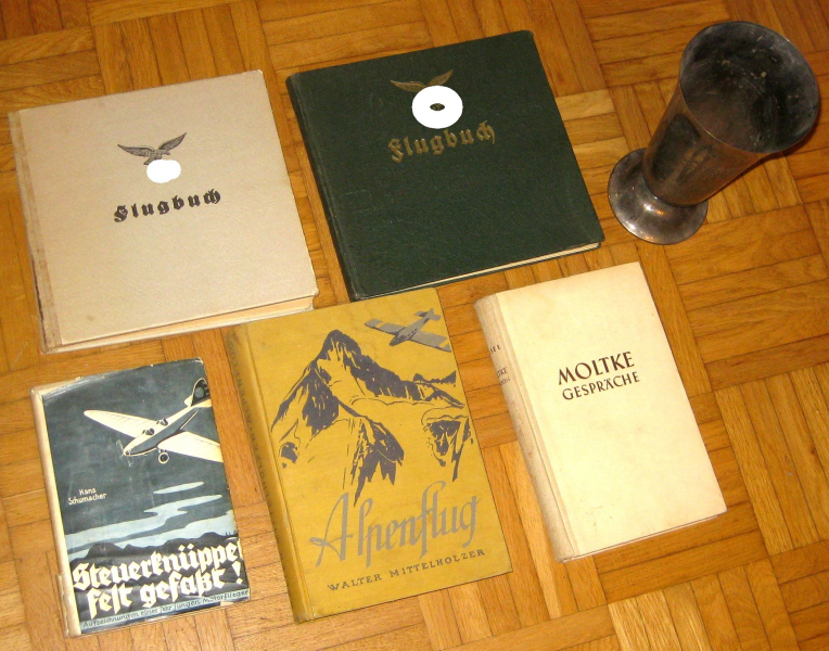 Original Flugbücher plus Silberpokal und 12 Fotos Luftwaffe. Zeeitraum 1942-1945. Flugmuster C445, Ju 52, Bf 198. Einsätze Kursk, Kiew, Charkow. Silberpokal mit Inschrift, Fotos mit RAD, Flugzeug Ju 52, Flugunfälle. Gebrauchte Erhaltung, Pokal angelaufen, Fotos teilweise beschriftet. Versand als Paket 7,50€