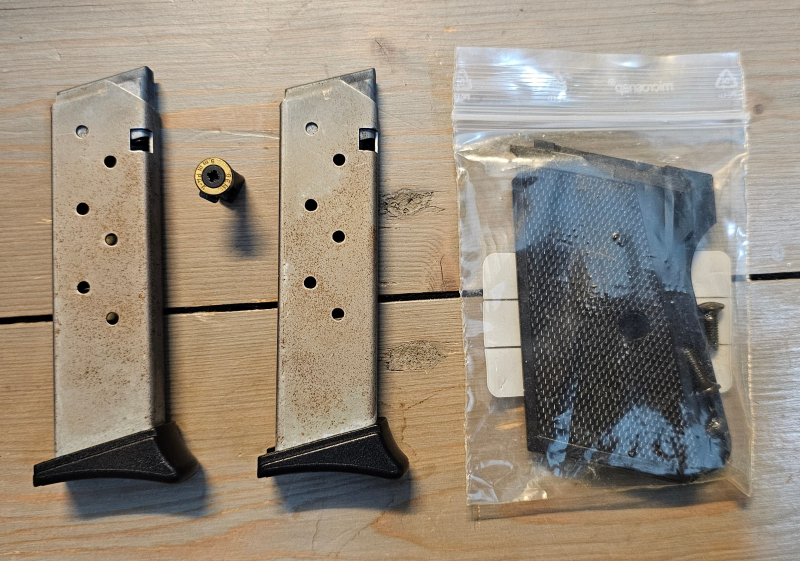 es sind 2 Magazine, ein Paar Kunststoff Griffschalen und ein Magazinhalteknopft für die (ich glaube) Para Sport Version. Rest siehe Foto.