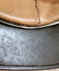 M35 Stahlhelm der XS Polizeidivision. Viel original Apfelgrüner Originallack, Stellenweise nachgedunkelt. Original Kinnriemen am Original Helmfutter-Aluring. Nur das Leder wurde ergänzt und ist reproduziert aber von sehr guter Qualität. Das Helmdach ist narbig.