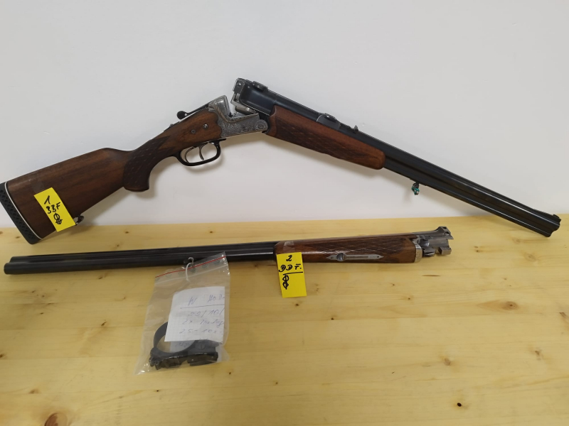 1 Stück Heym BBF 16/70 Kugel 7 x 65 R, dazu WL Bock Doppelflinte 16/16/70 mit Ejektor. Stahlsystem mit Gravur, doppelte Verriegelung. BDF Vorderschaft mit Leisten, jedes Laufpaar hat sepr. Vorderschaft. Läufe beider Paare blank und sauber, SEM komplette Montage vorhanden, passend für ZFR Zeiss 2,5 - 10 x 50 Diavari, gepflegte Gebrauchtwaffe, s. g. Zustand BBF Laufpaar Länge 60cm, Schaft 35 cm mit Gummikappe, gesamt 101 cm. Laufpaar BDF Länge 72 cm.