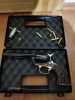 Ich musste einen Grat an einer der vergoldeten Schrauben entfernen, wodurch etwas von der Vergoldung abgetragen wurde. Ansonsten sieht der Revolver aus wie neu. Lieferumfang wie abgebildet. Anbei Kunststoffkoffer, und Reinigungsbürste.