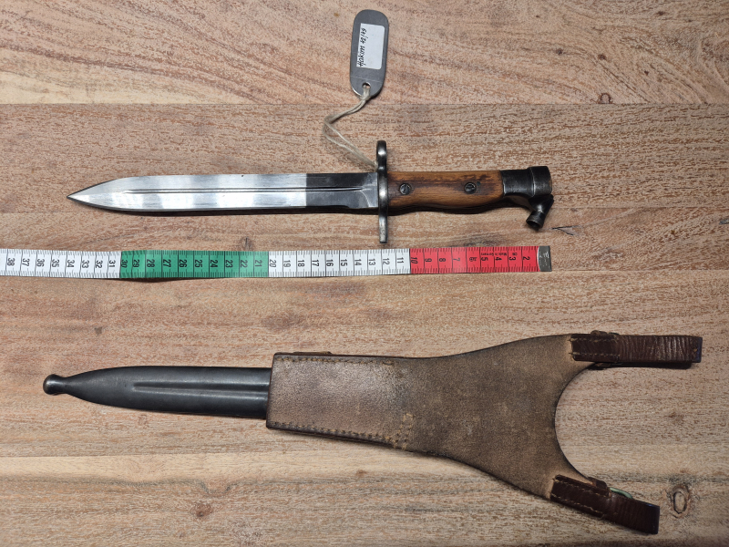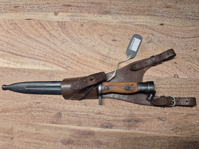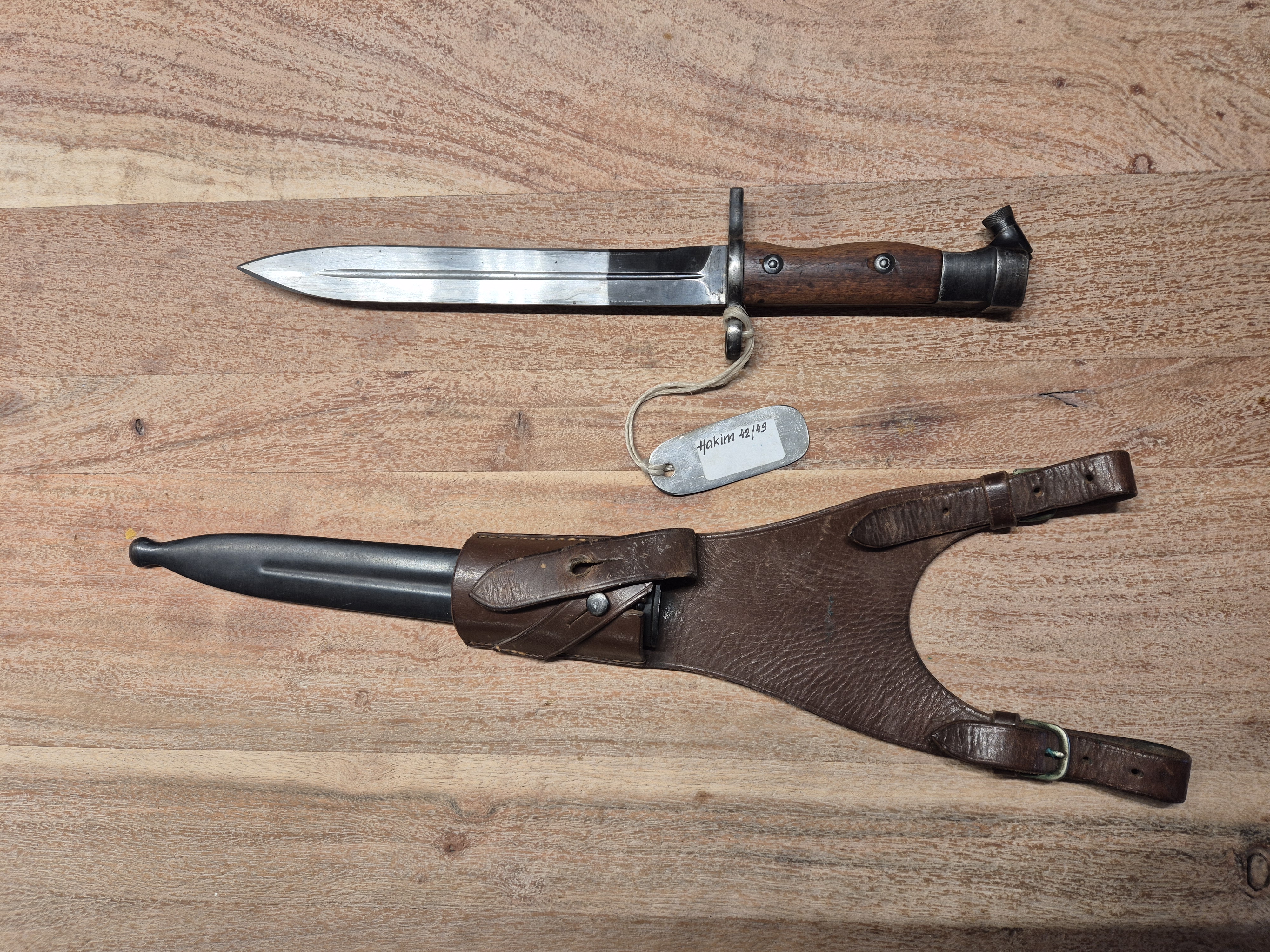 Bajonett Hakim, ägyptisch Das Bajonett gehört zu einem Hakim, einem ägyptisch Selbstladegewehr, welches eine Lizenzfertigung des schwedischen Automatgevär m/42 ist. Inkl. Scheide und Leder Koppelschuh!