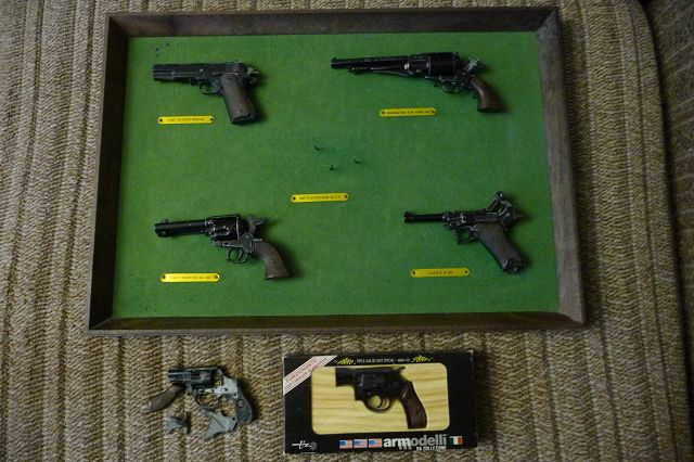 Watch out: No international shipping means no shipping to other countries as germany. No export. If you are highest bidder from other country as Germany you have to name a shipping address/ dealer in Germany. If you are bidding and no purchase is made, you have to pay the auction fees! Zum Verkauf kommt ein Display/ Setzkasten mit folgenden Miniaturen der Fa. Armodelli/Uniwerk: Colt 45/1911, Remington Army, Smith&Wesson 38, Colt Frontier, Luger P08. Neuwertig sind die nicht mehr, der Lack ist an einigen Stellen ab, also „used Look“. Beim Colt Frontier rastet der Hahn beim Spannen nicht mehr ein. Der S&W 38 war beschädigt, liegt in Teilen bei, ich gebe aber einen Neuwertigen dazu, in der OVP, so wie die Modelle damals verkauft wurden. Hähne kann man spannen, Schlitten oder Kniegelenk bewegen, Trommeln ausschwenken. Die Modelle waren zum Verschiessen von Spielzeug Zündhütchen vorgesehen, dafür halte ich die Federn aber zu schwach. Das Display hat die Maße 37 cm x 26 cm. Die Firma Armodelli/Uniwerk in Italien hatte in den 1970er Jahren diese Modelle hergestellt, aber nach dem Abbrand der Fabrik wurde die Produktion eingestellt. Nach Ablauf der Auktion erhalten Sie meine Kontodaten über E-Post. Da dies ein Privatverkauf ist, kann ich weder Garantie noch Rückgaberecht einräumen. Versendet wird nur innerhalb Deutschland als versichertes Paket nach Zahlungseingang des Käufers. Zahlung bitte innerhalb von 14 Tagen, ansonsten gilt der geschlossene Kaufvertrag als aufgelöst. Versandkosten von 7,70 € trägt der Käufer. Verkauf nur an Personen über 18 Jahre, Altersnachweis (Kopie Personalausweis) per Ablichtung, E-Post oder Post erbeten. Bei ID Mitgliedschaft erübrigt sich natürlich der Altersnachweis. Bieten Sie bitte nicht, wenn Sie mit diesen Bedingungen nicht einverstanden sind.