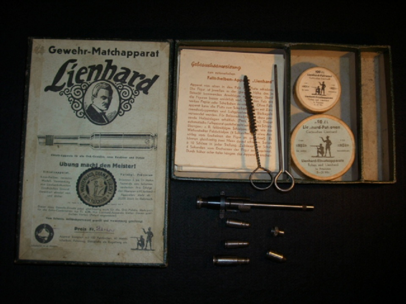 aus meiner Sammlung gebe ich ab ein Lienhard Gewehr- und Pistoleneinsätzen nach militärischen Stand, In der Schachtel mit allen Zubehör, Schachtel nur teilweise mit ZH + Kugel besetzt , verschiedene Scheiben, Literatur Blätter, Putz- und Ausstosser , im guten Zustand, bitte Foto anschauen