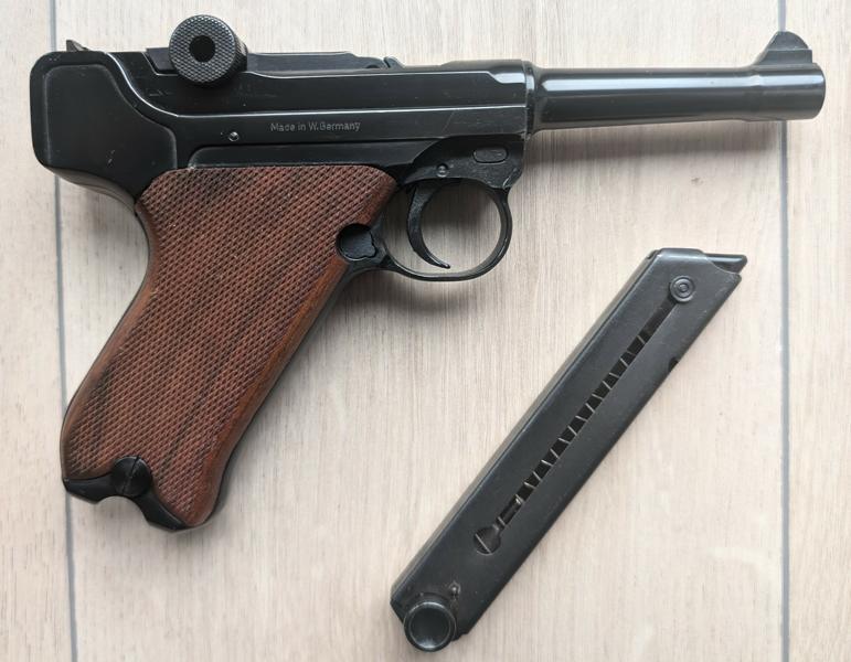 Ich biete hier einen erstklassigen Parabellum 08 Nachbau, gefertigt vom Top Hersteller Erma, im starken Kaliber 8mm Knall zum Verkauf an.