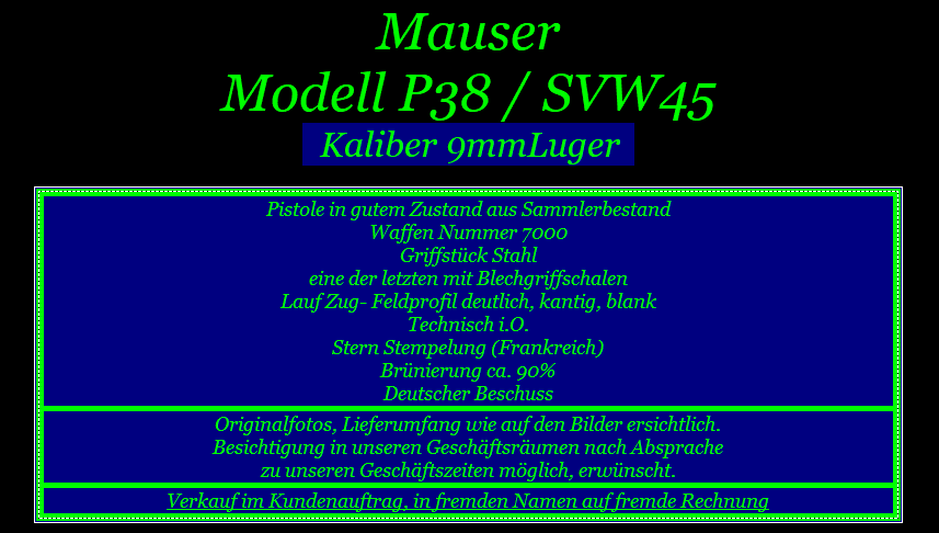 Artikel-ID: 20177263  •  ArtikelNr. des Verkäufers: 12243  •  Kategorie: Sammlerwaffen/-munition > Kurzwaffen > 1900 - 1945