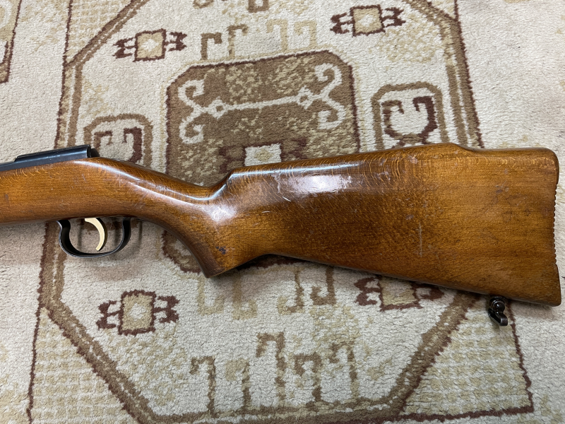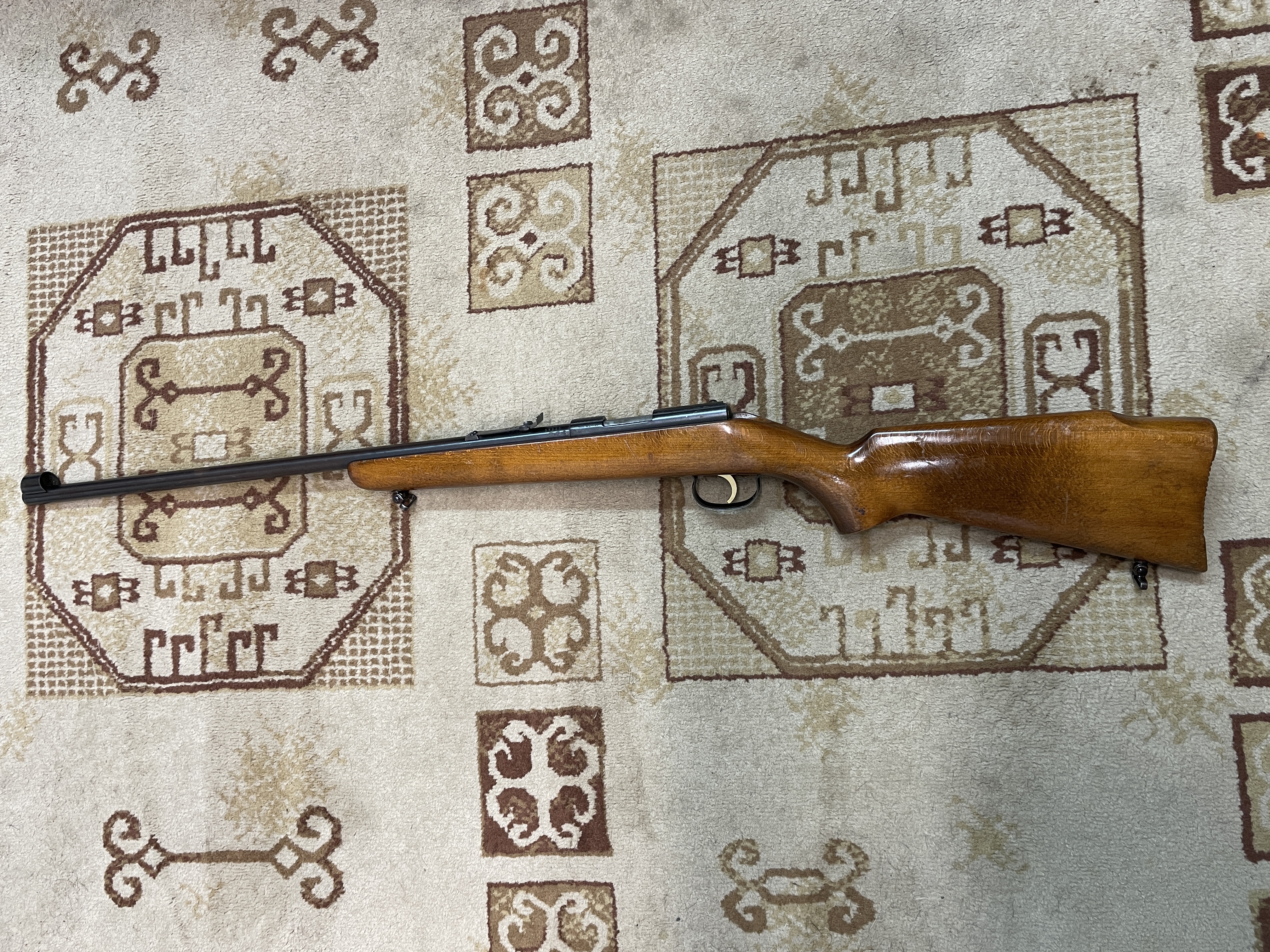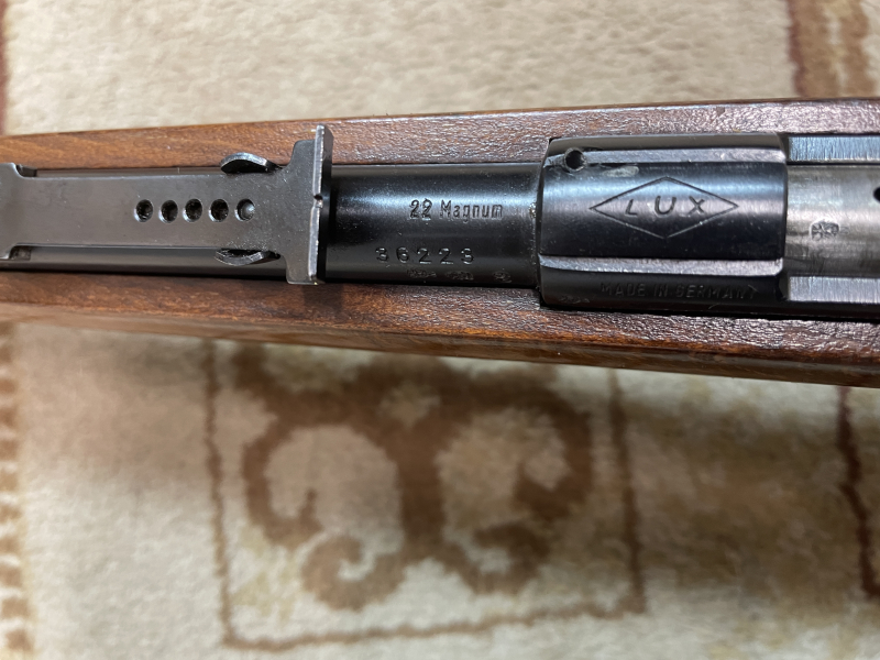 Zum Verkauf kommt eine Einzellader Büchse im Kal. .22WM Fa. Lux. Die Waffe hat offene Visierung und 11mm Prismenschiene. Gesamtlänge ist 98cm, Lauf 54cm, Abzug 34cm. Schaft u. Lauf haben mittlere Gebrauchsspuren, der Lauf ist innen blank. Verkauft wird nur gegen Vorlage einer gültigen Erwerbsberechtigung (EWB) und den erforderlichen NWR-Id.Nr.: P + E!