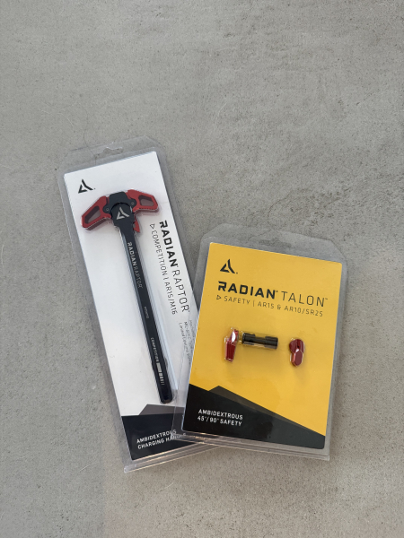 Zum Verkauf steht ein Set aus Radian Raptor Ladehebel und Radian Talon Sicherung in rot.