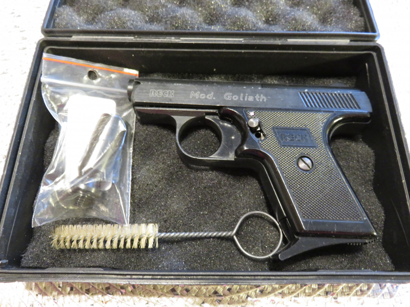 Privat Verkauf Eine nicht mehr hergestellte Reck Goliath 9 mm P:A:K sie ist die kleinste Schreckschusspistole zur Selbsverteiligung spetziell für die Dame .Aber auch mit dem Raketenbecher für Sylvester einsetzbar. Sie wiegt nur 420 g und ist 134mm lang . Sie kann also leicht in der Jackentasche gesteckt werden., sie hat Magazinkapazität von 4 Schuss 9mm Schreckschuss. Sie funktioniert einwandfrei, ist soliede gebaut und eigentlich unkaputbar. Sehr rahr und selten .