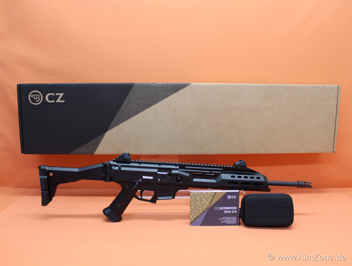 Ha.Büchse 9mmLuger CZUB CZ SCORPION EVO 3 S1: CARBINE COMP 16" Lauf (kaltgeschmiedet) mit Mündungsgewinde (1/2-28)/ Kompensator, Spannhebel li./re. umbaubar, schwarzes Polymer-Waffengehäuse mit Picatinnyprofil, beidseitigen Bedienelementen: Sicherung /Magazinlösehebel, Polymer M-LOK Top-Rail-System/ -Handschutz, seitenklappbarer Polymer-Schubschaft (3664-0706-ADKAXDX). Incl. einstellbarer Ghost-Ring-Visierung/ Reinigungsset. Karton als Transportverpackung. Lieferung OHNE Magazin!