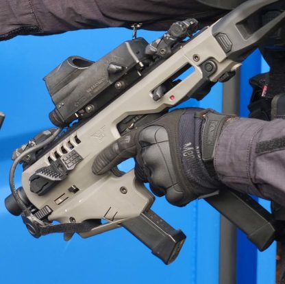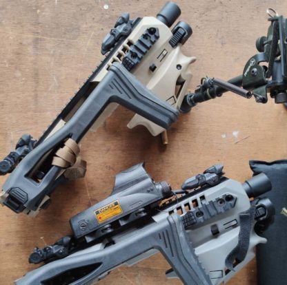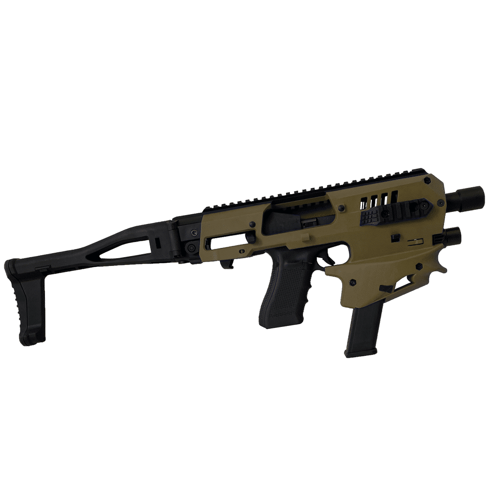CAA MICRO CONVERSION KIT GLOCK 17/19/19X/22/23/25/31/32/45 RONI G5 Alu / Passt auf Glock GEN.3/4/5 Oliv Schaftsystem CAA MICRO RONI Conversion Kit f�r GLOCK-Pistolen. Ein System aus Polymer und Aluminium, der halbautomatische Pistolen in handliche Karabiner verwandelt, die sich zur Selbstverteidigung, Nachsuche, f�r das Sportschie�en und f�r taktische Eins�tze eignen. Nach Einbau der Pistole in das MICRO RONI G5 Schaftsystem bleibt Ihre Pistole nach den gesetzlichen Vorschriften eine Kurzwaffe - Kann auch mit eingeklapptem Schaft bedient werden. Dieses CAA Micro Conversion Kit ist eine leichte und robuste Plattform f�r Glock Handfeuerwaffen. Es hat einen Laufmantel aus Aluminium mit einem Polymergeh�use. Schnellster Carbine Kit / Umr�stsatz auf dem Markt. Verbessert die Genauigkeit bis auf 180m Top Eigenschaften: Kein Zerlegen der Pistole oder �nderungen an der Waffe erforderlich - einfach die Pistole in das Kit legen, verriegeln und loslegen! Ausgestattet mit Stabilisator, der das Schie�en im zusammengeklappten und verriegelten Zustand erm�glicht. Einfaches und schnelles Einsetzen und Entnehmen der Pistole. Verf�gt �ber einen verbesserten Ersatzmagazinhalter, der mit einem Magazinverschluss und einem Magazinentriegelungsknopf funktioniert. Kompatibel mit unserem Micro Conversion Kit H�lsenf�nger Die Montage innerhalb von wenigen Sekunden! Keine �nderungen an der Waffe notwendig. Eine durchgehende Weaver-Picatinny Schiene aus Aluminium erlaubt die flexible Montage von verschiedenen Visierungen und Optiken. Beidseitige Trigger-Guard-Sicherheit. Ladehebel beidseitig bedienbar. Schaft wird nach rechts weggeklappt. Ergonomischer Fingerrillen-Griff f�r mehr Stabilit�t. Seitliche Picatinny-Schienen zur Montage von zus�tzlichem Zubeh�r, z.B. Daumenst�tzen. Beidh�ndiger eingebauter Ladegriff f�r schnelle und einfache Handhabung. Rechts klappbare Schaft, verriegelt in eingeklappter Position. Eingebauter Ladegriff f�r schnellere Montage/Demontage. Freigelegter Schlittenausl�ser f�r direkten Kontakt und einfachere Bedienung. Inklusive Magazinhalter. Farbe: Oliv Die CAA Klapp-Visierungen, Riemen�se mit Riemen, Transportkoffer, H�lsenf�nger, Daumenauflagen und diverse Red Dots sind bei uns im Shop zu finden und auf Lager. Geeignet f�r: Glock 17/19/19X/22/23/25/31/32/45 GEN3 bis GEN5 Der Micro Roni Conversion Kit ist ohne Erlaubnis f�r jeden erwerbbar. Ma�e: Breite: 2.48" H�he: 5.70" L�nge: 13.70"