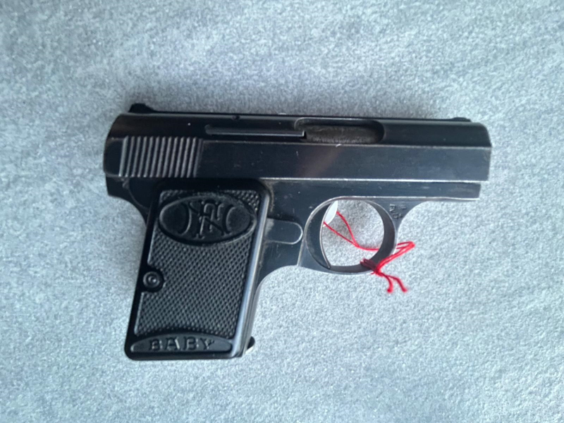 Pistole FN Modell Baby Kaliber 6,35mm. Kein Rost. Lauf blank. Zustand 2+.Nummerngleich. Griffschalen ohne Risse. Waffen stammt aus einer Sammlung, wird im Kundenauftrag verkauft. Differenzbesteuerung. Alle Angaben nach bestem Wissen und Gewissen. "Beantworte keine E-Mails". Den beschriebenen Zustand entnehmen Sie bitte aus den Bildern. Internationaler Versand ist nur möglich, wenn Sie mir Ihren deutschen Waffenhändler nennen, der den Waffenexport für Sie übernimmt.
