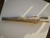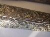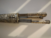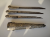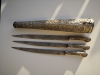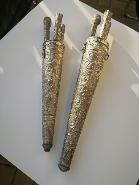 Verkaufe hier zwei sehr schöne Antike Janitscharen Messerset (osmanisch), bestehend aus einen großen Messerset ca. 40cm lang, mit drei Messern und einen kleineren Messerhalter mit drei Messern. Die Stücke bestehen aus Versilberten Messing , die Messer sind mit Inschriften . Die Messingscheide ist mit Ranken und Schuppen reich verziert. Ebenso die Griffe sind sehr schön gestaltet und die Klingen tragen Inschriften. Der Gesamtzustand ist sehr gut , Am größten Set fehlt unten die Perle. Die beiden Stücke stammen aus dem 19 Jahrhundert oder älter.