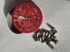 Angeboten werden 19 Kartuschen für Bolzensetzgerät, gefaltet, starke Ladung, Kal. ?3/12. Der Durchmesser der Patronen beträgt 7 mm, sie passen also NICHT in Pistolen oder Revolver mit Kal. .22 lang oder 6 mm Flobert. Der Herstellerangabe "Giulio Fiocchi" und dem Zustand der Dose nach zu schließen, dürfte diese Munition schon etwas älter sein. Der optische Zustand der Patronen ist einwandfrei, an der Spitze sind sie mit rotem Wachs oder Lack verschlossen. Die Funktion der Patronen kann nicht garantiert werden, daher biete ich sie als Sammlerstück an.