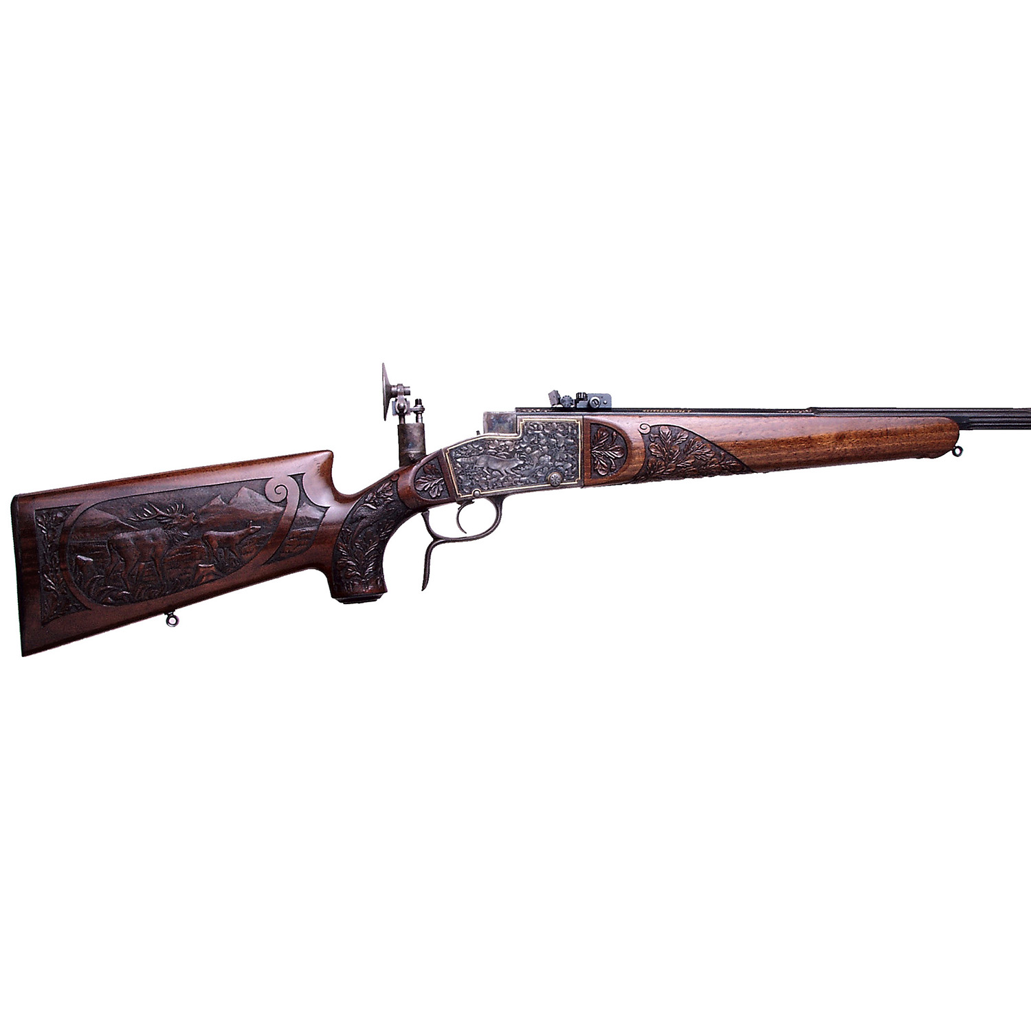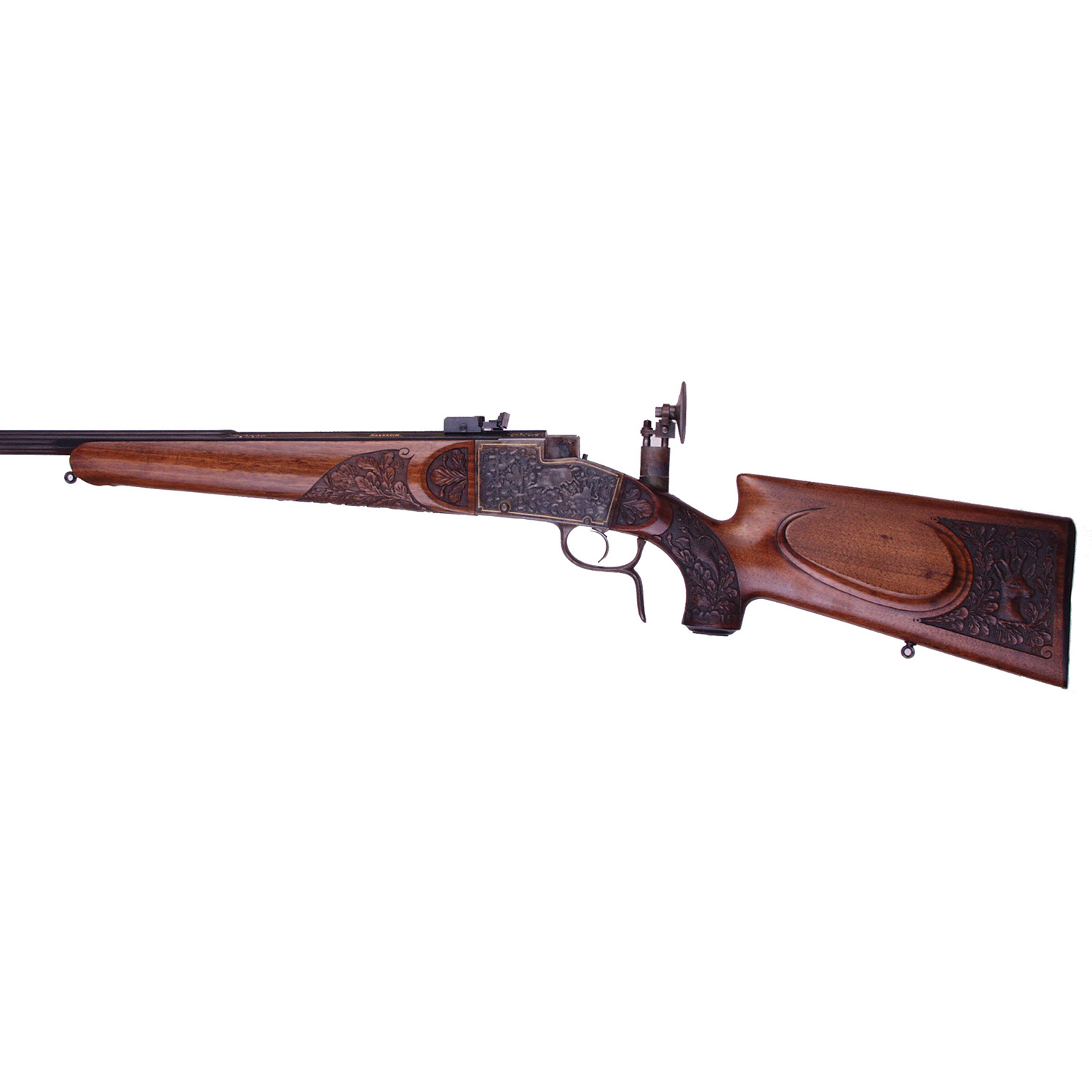Jagdliches Kleinkalibergewehr mit Goldeinlagen und schöner Schaftverschneidung. Alte Scheibenwaffen 2 Seite 336. Albl Seite 298. Kleinkaliber-Stutzen Nachdem in den 1920er Jahren das Kleinkaliber-Schießen in Deutschland sehr populär wurde, kamen die unterschiedlichsten KK-Gewehre auf den Markt. Einerseits in sportlicher Ausprägung, andererseits als vormilitärische Sportwaffe. Und natürlich in „klassischer Form“ als KK-Scheibenstutzen. Kleinkaliber-Gewehr Langenhan „Frauenstorfer Mannheim“ . Dieses aufwändig gestaltete Kleinkaliber-Gewehr weicht von den bekannten Stutzen in einigen Details ab. Es ist weder ein Scheibenstutzen, noch ein KK-Sportgewehr. Auch kann man es nicht als eine Jagdwaffe bezeichnen. Der Schaft ist mit einem Pistolengriff geformt und hat eine ovale Backe. Das Gewehr hat keinen Stecher. Der Abzug ist am Systemkasten oben mit einem Vierkant einzustellen Das KK-Gewehr im Kaliber .22 lr. ist von der Firma Langenhahn aus Zella St. Blasii. Der Hersteller ist L.Frauenstorfer Mannheim Dies ist in Gold am Lauf eingelegt. Die Visierung besteht aus einem Diopter mit Feldvisier Balkenkorn. Die Waffe trägt die Nummer xxxx und das Herstellungsjahr ist ca.1920. Die Gesamtlänge beträgt 1110mm, die Lauflänge 724mm und das Gewicht 3760gr. Das Laufäußere hat 14 Lauffalzen am Achtkantlauf. Holzverschneidung: Eichenlaub und Perlhuhn am Vorderschaft, am Pistolengriff Fasane und Eichenlaub. Am Schaft links Rehbock und Eichenlaub, rechts Hirsch und Hirschkuh. Gravuren: Links zwei Wildsauen im Kampf, rechts Eichenblätter, Fuchs und Hase. Goldeinlagen: Am Systemkasten und am Lauf und das Monogramm TO.
