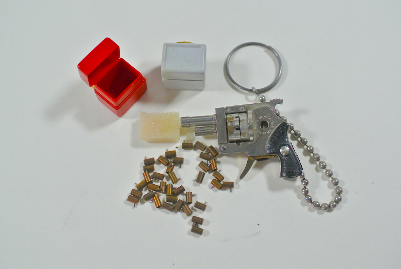 Dieser SixShooter von XYTHOS ('kleinster Revolver der Welt') verfeuert 2mm Knall(Stift)patronen. Der Revolver wurde vielfach benutzt, daher ist an der Trommel das Chrom etwas abgeplatzt – ein schlichter Schönheitsfehler, der die VOLLE Funktionsfähigkeit nicht beeinträchtigt. Die Waffe ist ohne PTB Prüfzeichen, weil sie vor 1969 gebaut/erworben wurde (nach 1969 hatten baugleiche XYTHOS-Revoler das Prüfzeichen PTB 82)................................................................................ Zu diesem Angebot gehören auch 71 Patronen (35 Stück passende 2mm Stiftpatronen in einer grauen Original-Xythos-Packung und 36 Stück passende 2mm Patronen in einer roten Original-Xythos-Packung). Da erfahrungsgemäß etwa jede fünfte Patrone nicht zündet, ist also von 56 funktionsfähigen Patronen auszugehen................................................................. Bitte beachten: Dies ist ein Privatverkauf zu den hierbei üblichen Bedingungen. Der Revolver darf außerhalb der eigenen Wohnung nur von Inhabern des kleinen Waffenscheins mitgeführt werden! Altersangabe unbedingt erforderlich. KEIN internationaler Versand (NO international shipping). ................................................................ Versandkosten für Versand mit Sendungsverfolgung: 7,00 Euro (trägt der Käufer)................................................................